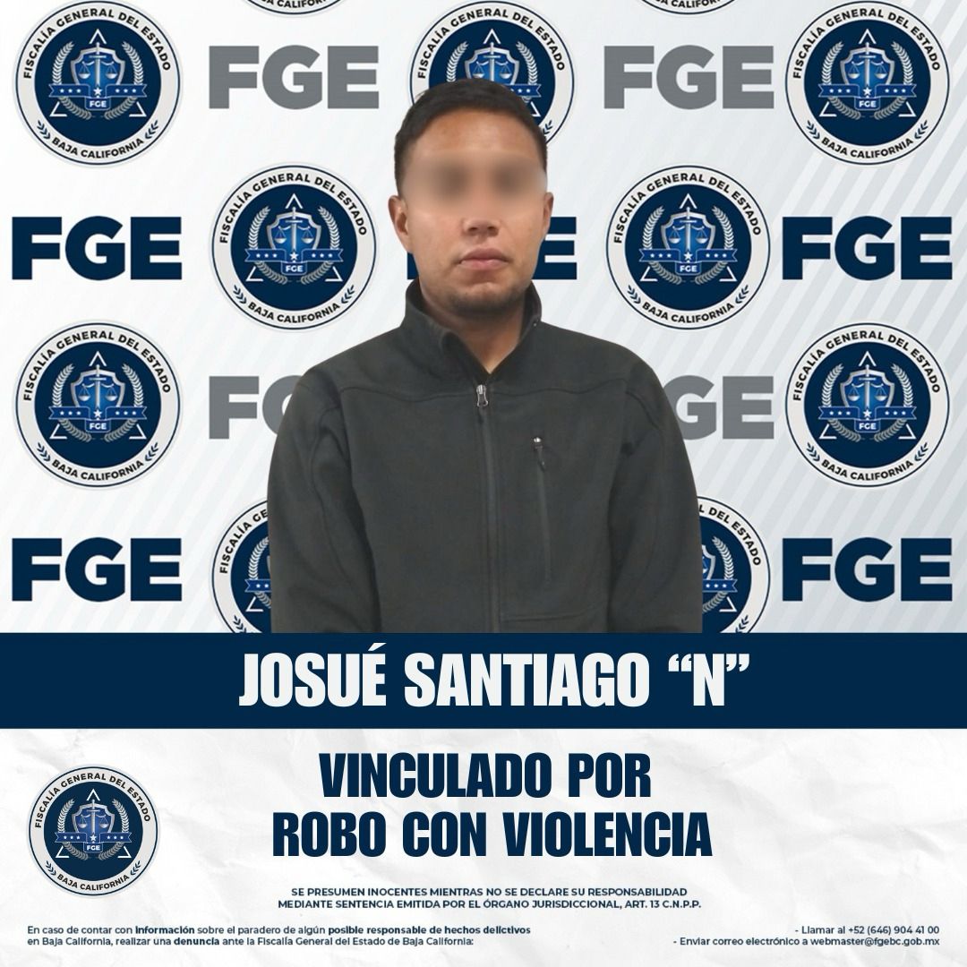 ENSENADA, BAJA CALIFORNIA. - La Fiscalía Regional de Ensenada logró que Josué Santiago “N” fuera vinculado a proceso por su presunta participación en un robo con violencia cometido en un establecimiento Oxxo de la colonia Empleados, por lo que permanecerá bajo la medida cautelar de prisión preventiva oficiosa.