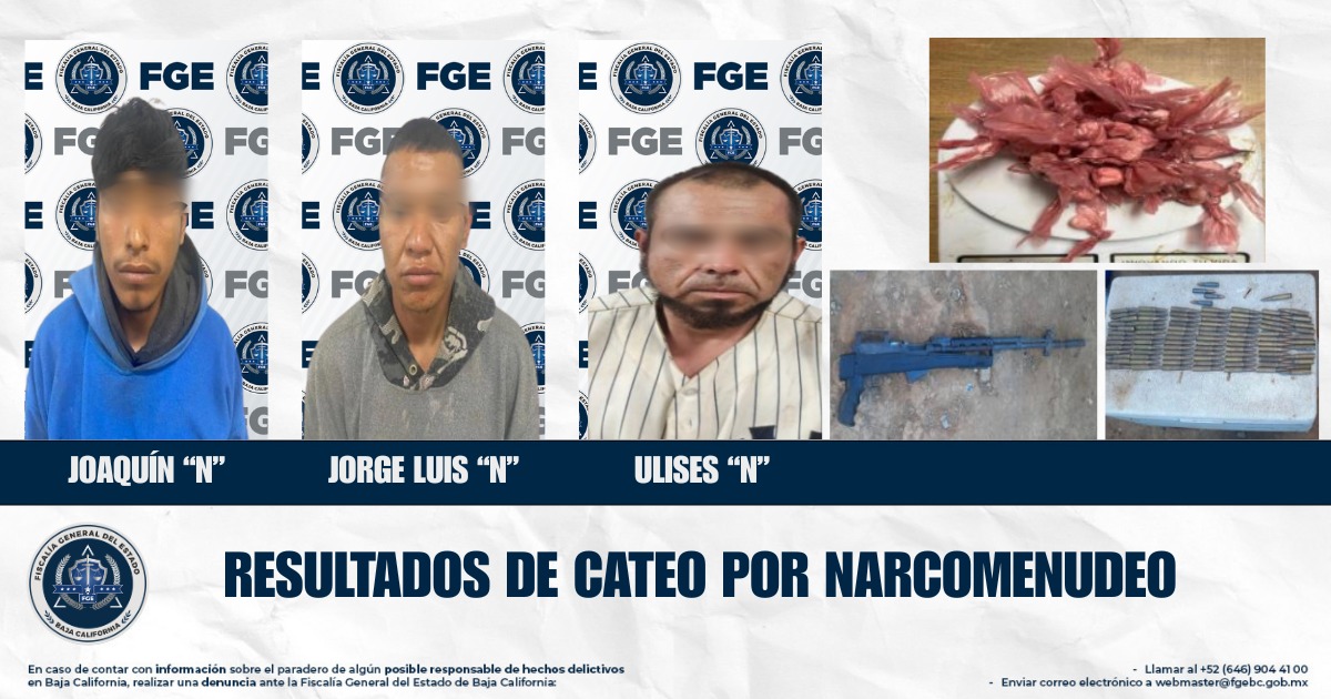 SAN QUINTÍN, BAJA CALIFORNIA. - En seguimiento a investigaciones por narcomenudeo, la Fiscalía General del Estado llevó a cabo un cateo en un domicilio ubicado en la colonia Benito García, San Quintín, donde fueron asegurados tres sujetos, droga, un arma de fuego y cartuchos útiles.