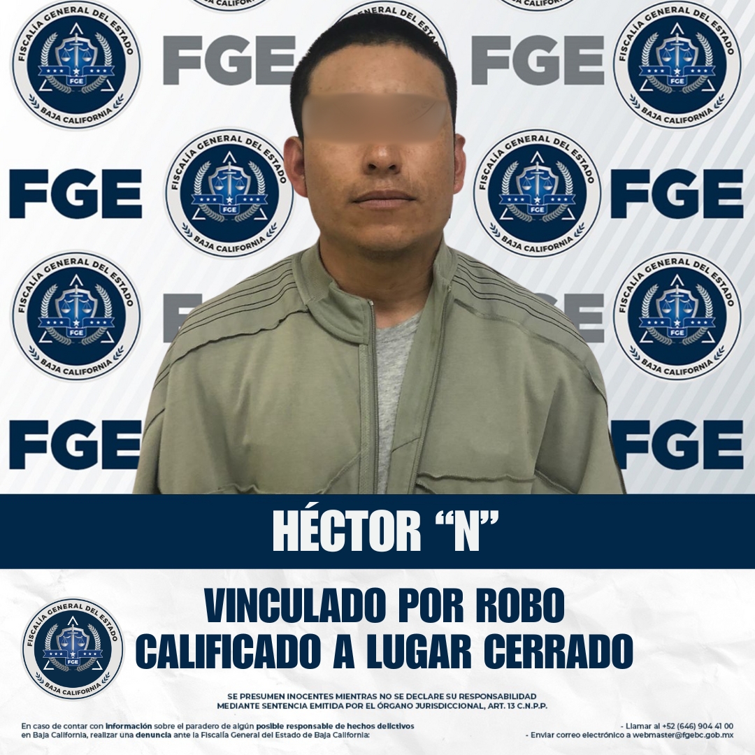 SAN QUINTÍN, BAJA CALIFORNIA. - La Fiscalía Regional de San Quintín, en coordinación con la Unidad de Investigación de San Quintín, logró la cumplimentación de una orden de aprehensión y la vinculación a proceso de Héctor “N” por el delito de robo calificado a lugar cerrado.