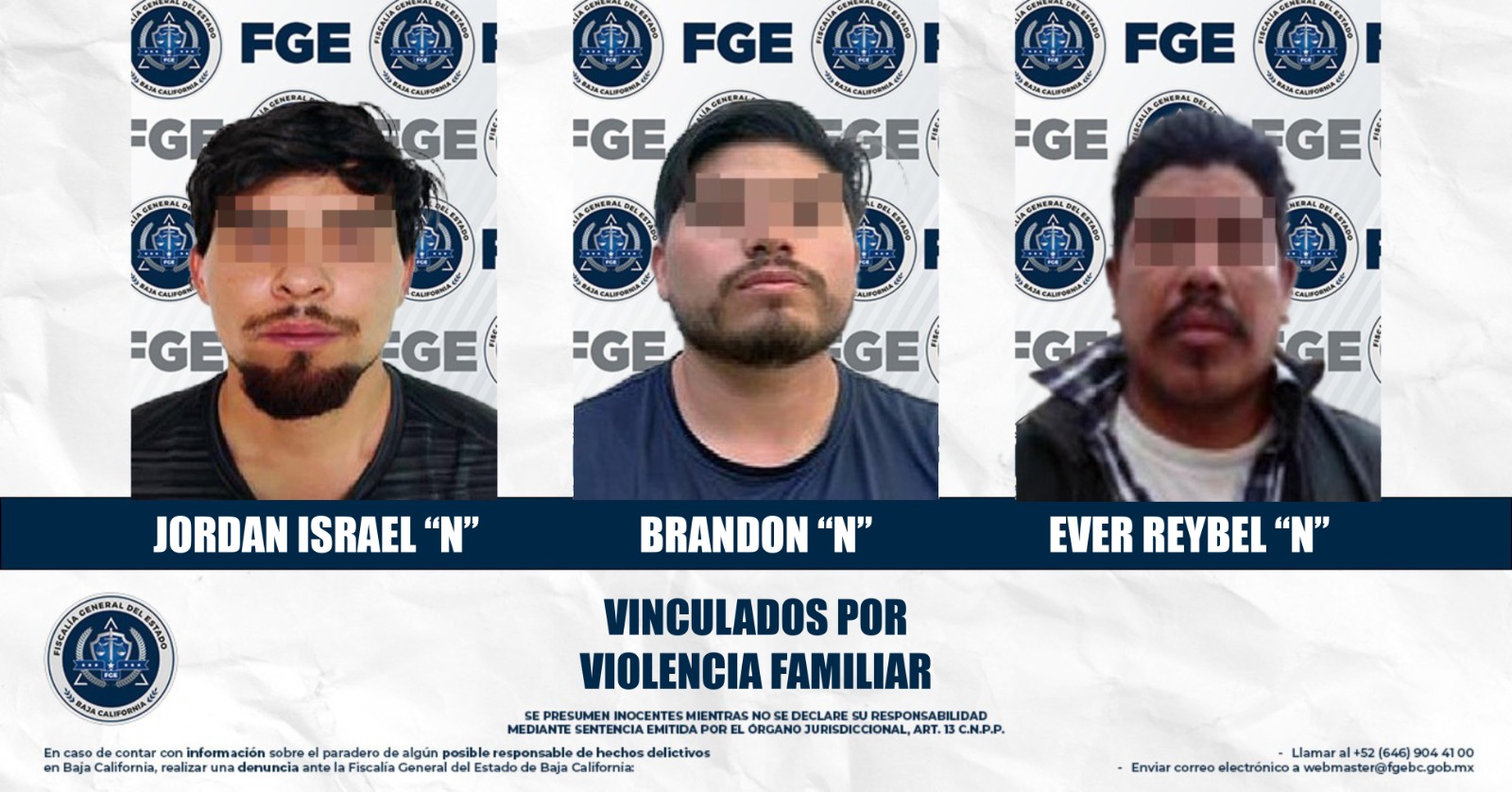 MEXICALI, BAJA CALIFORNIA. - La Fiscalía Regional de Mexicali obtuvo la vinculación a proceso de tres hombres por el delito de violencia familiar, durante audiencias realizadas por separado.