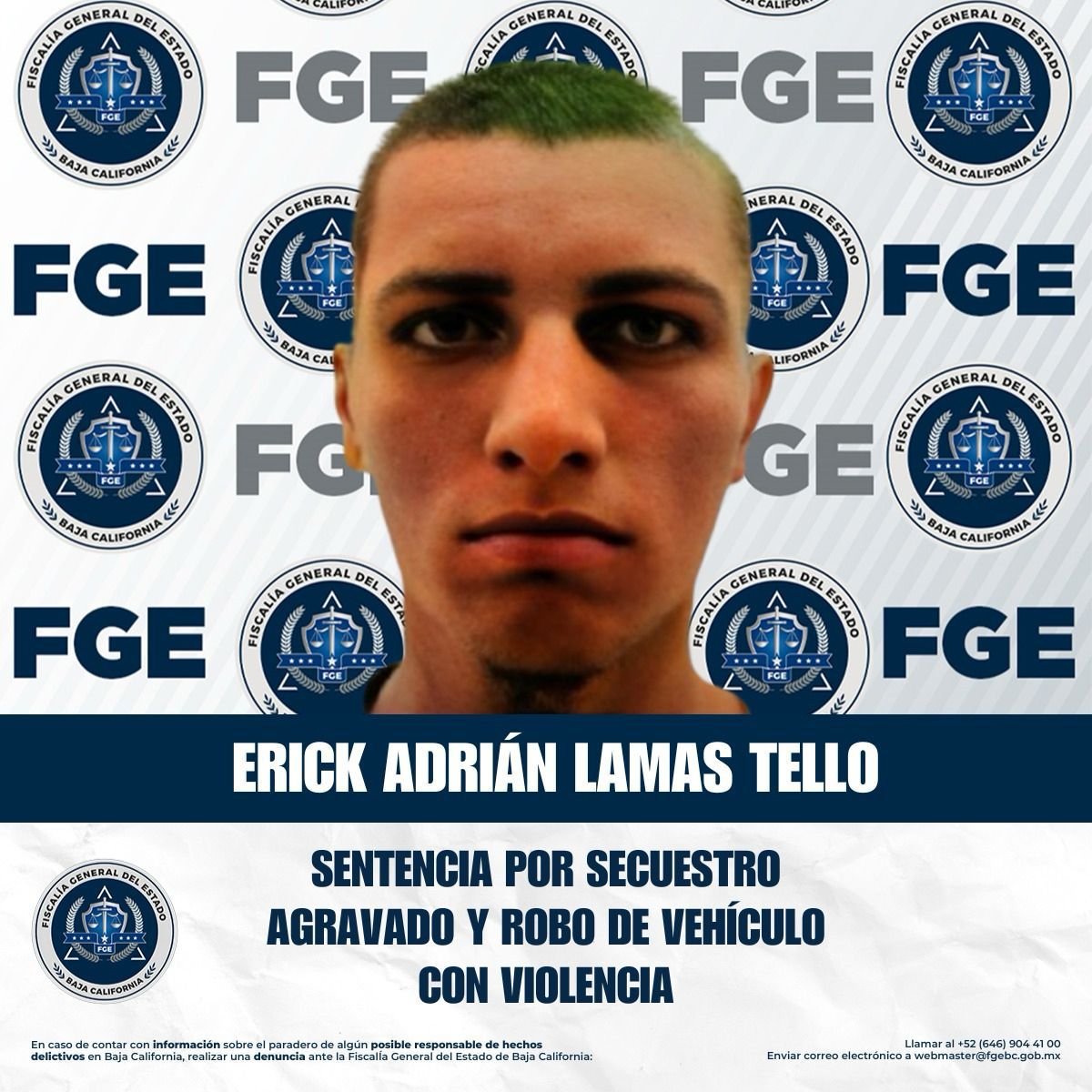 TIJUANA, BAJA CALIFORNIA. - La Fiscalía Regional de Tijuana, por medio de la Coordinación de Averiguaciones Previas y Control de Procesos, obtuvo sentencia condenatoria en contra de Erick Adrián Lamas Tello, alias “El Father”, al ser declarado penalmente responsable de los delitos de secuestro agravado y robo de vehículo de motor con violencia.
