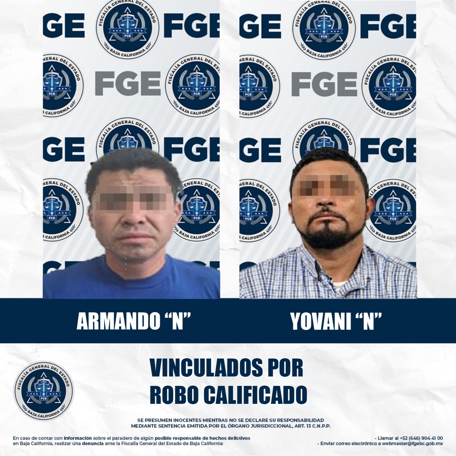 MEXICALI, BAJA CALIFORNIA. - La Fiscalía Regional de Mexicali, a través de la Unidad de Investigación de Delitos de Robo Poniente, obtuvo la vinculación a proceso de dos hombres imputados por los delitos de robo calificado en establecimiento comercial abierto al público con violencia y robo calificado cometido con violencia.