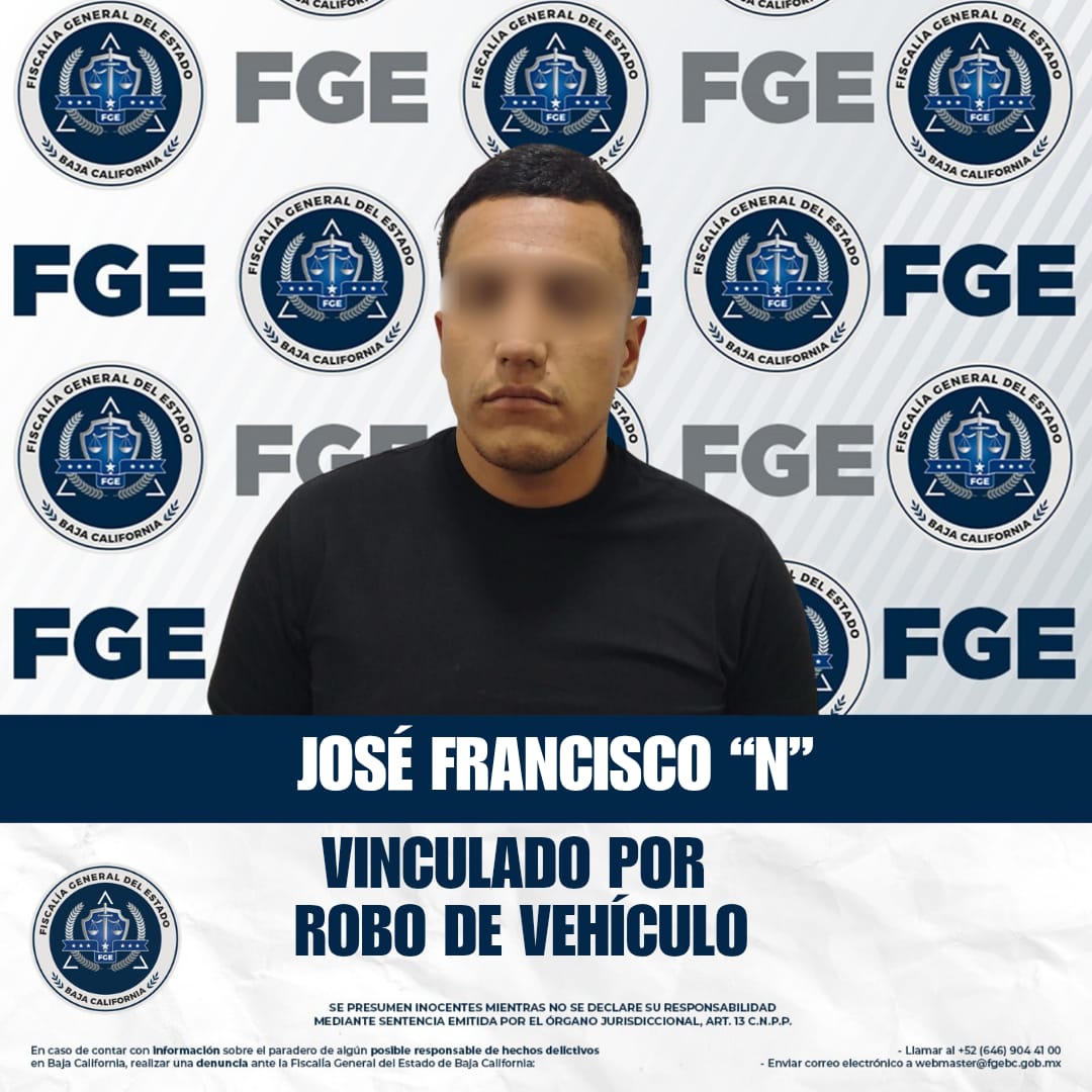 ENSENADA, BAJA CALIFORNIA. - La Fiscalía Regional de Ensenada, a través de la Unidad de Investigación de Robo de Vehículos, logró la vinculación a proceso de José Francisco “N”, investigado por su presunta participación en diversos robos de vehículos, considerado un objetivo prioritario dentro de las investigaciones de la institución.