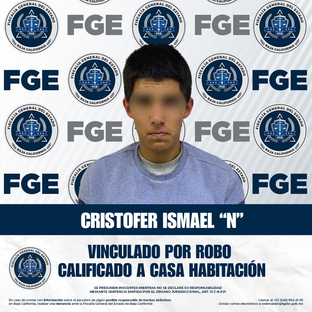 SAN QUINTÍN, BAJA CALIFORNIA. - La Fiscalía Regional de San Quintín informa que, derivado de una investigación, se obtuvo auto de vinculación a proceso en contra de un hombre por su probable responsabilidad en el delito de robo calificado a casa habitación, cometido en el ejido Nuevo Mexicali.