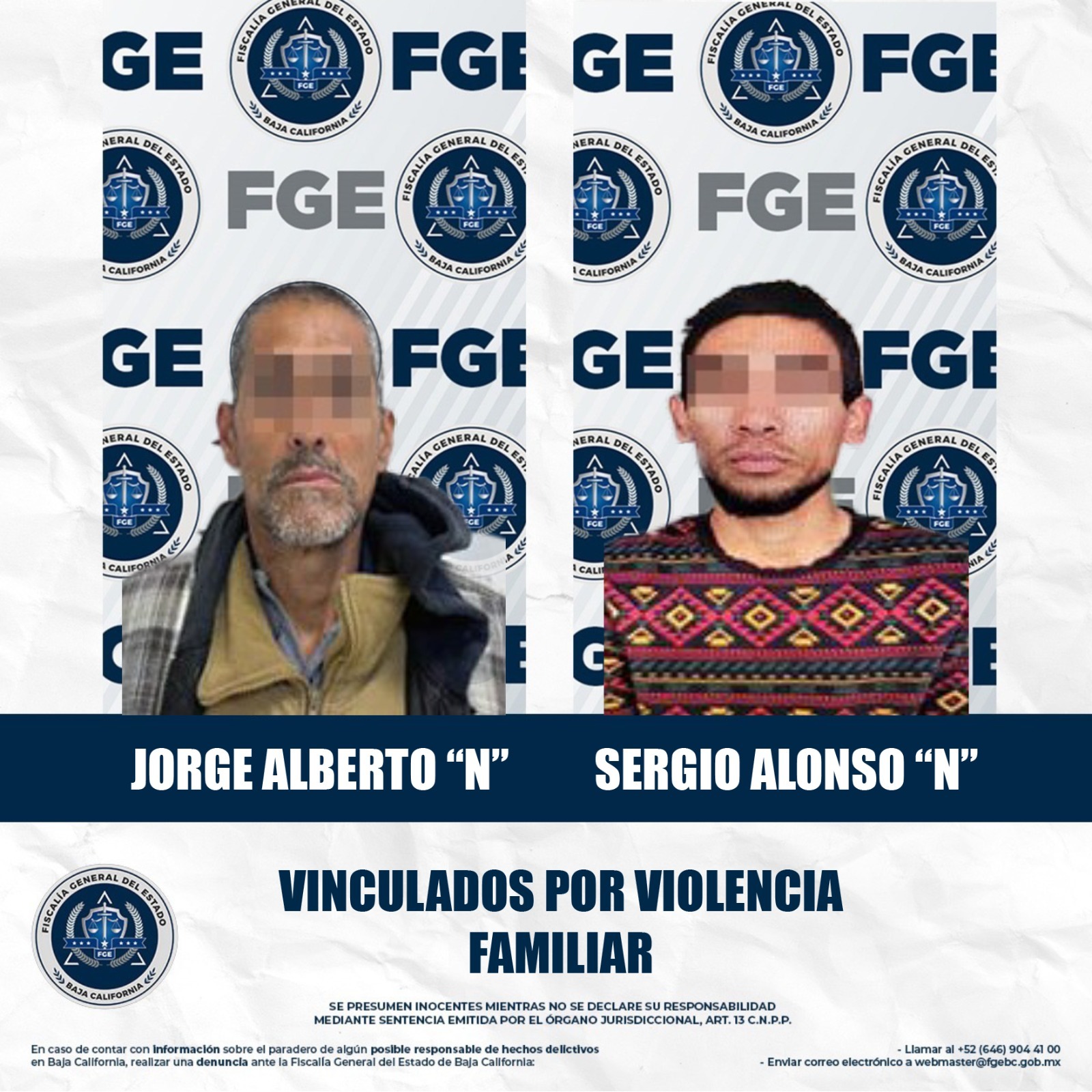 MEXICALI, BAJA CALIFORNIA. - La Fiscalía Regional de Mexicali, a través de las Unidades de Investigación de Delitos Foráneos Guadalupe Victoria y Ciudad Morelos, obtuvo la vinculación a proceso de dos hombres imputados por el delito de violencia familiar.