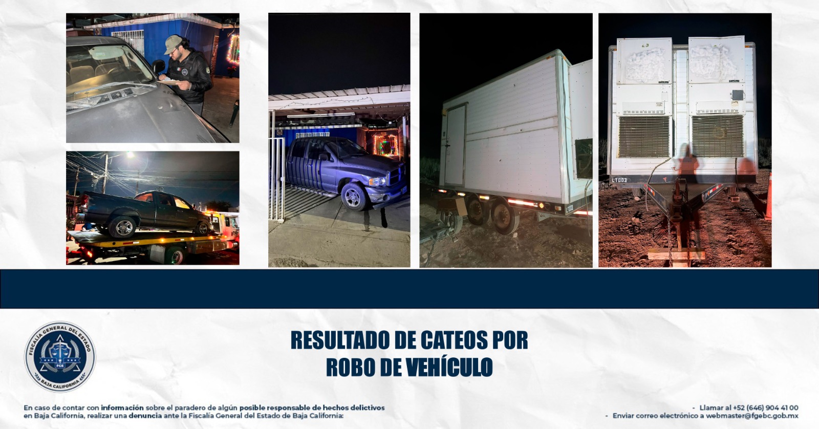 MEXICALI, BAJA CALIFORNIA. - Como resultado de las acciones permanentes para combatir el delito de robo de vehículos, la Fiscalía Regional de Mexicali localizó y aseguró un remolque acondicionado como oficina y un vehículo tipo pick up, ambos con reporte de robo vigente, durante la ejecución de cateos autorizados por un Juez Penal.