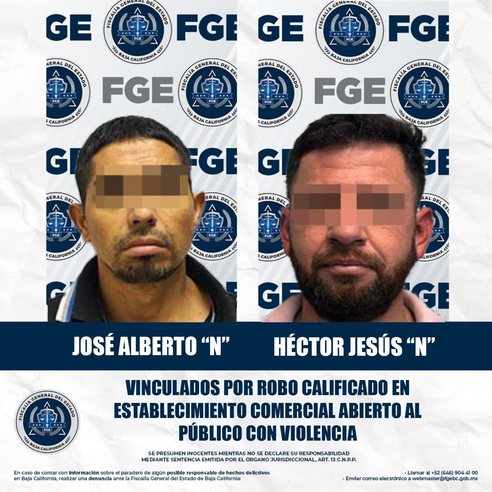 MEXICALI, BAJA CALIFORNIA. - La Fiscalía Regional de Mexicali, a través de la Unidad de Investigación de Delitos de Robos Poniente, obtuvo la vinculación a proceso de dos hombres imputados por el delito de robo calificado en establecimiento comercial abierto al público con violencia.