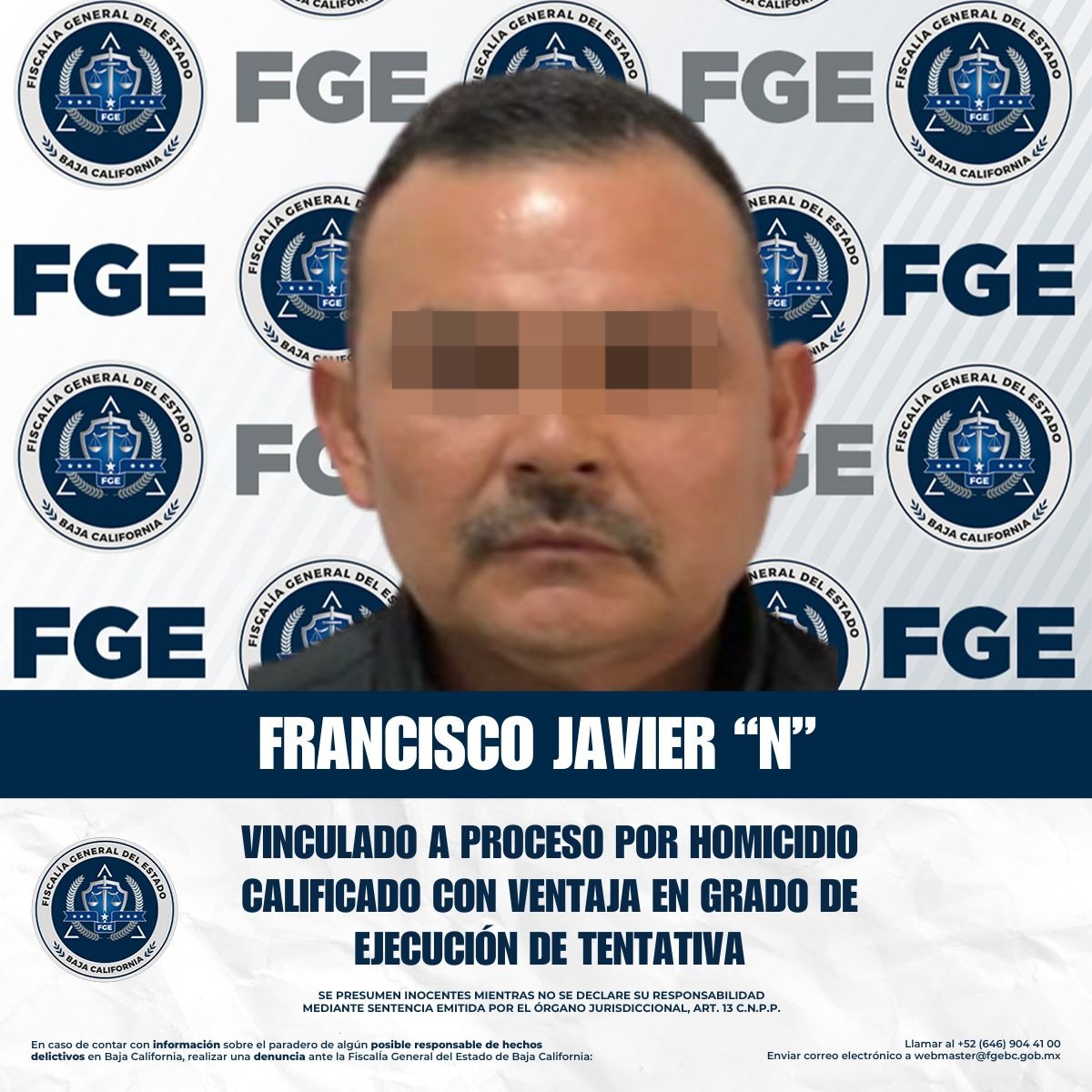TIJUANA, BAJA CALIFORNIA. - La Fiscalía General del Estado, a través de la Fiscalía Especializada en Delitos Contra la Vida, obtuvo la vinculación a proceso de Francisco Javier “N”, por su presunta responsabilidad en el delito de homicidio calificado con ventaja en grado de ejecución de tentativa.
