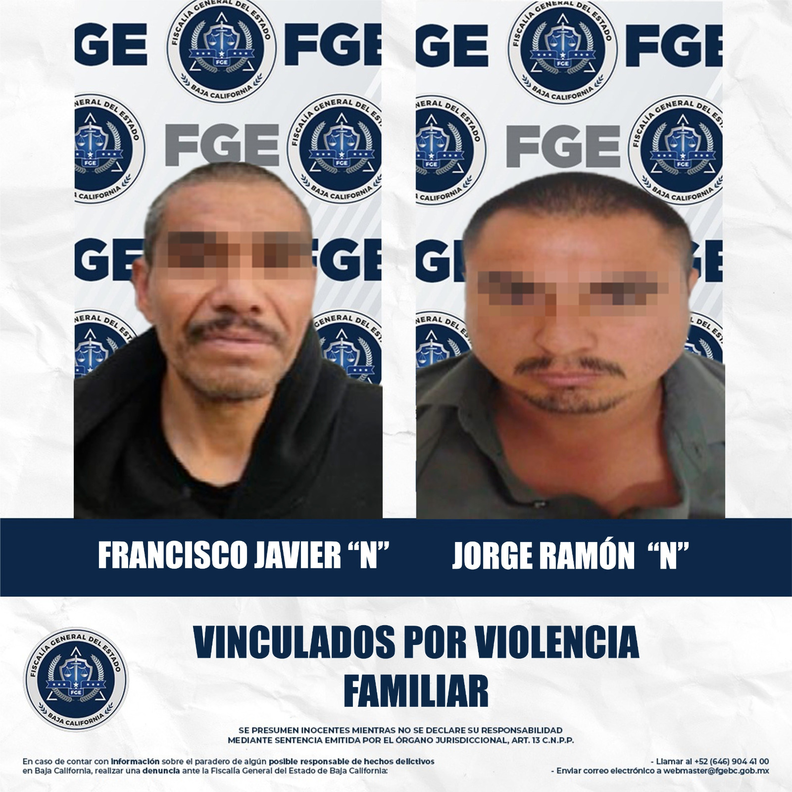 MEXICALI, BAJA CALIFORNIA. - La Fiscalía Regional de Mexicali obtuvo la vinculación a proceso de dos hombres imputados por el delito de violencia familiar, tras hechos atendidos en audiencias distintas.