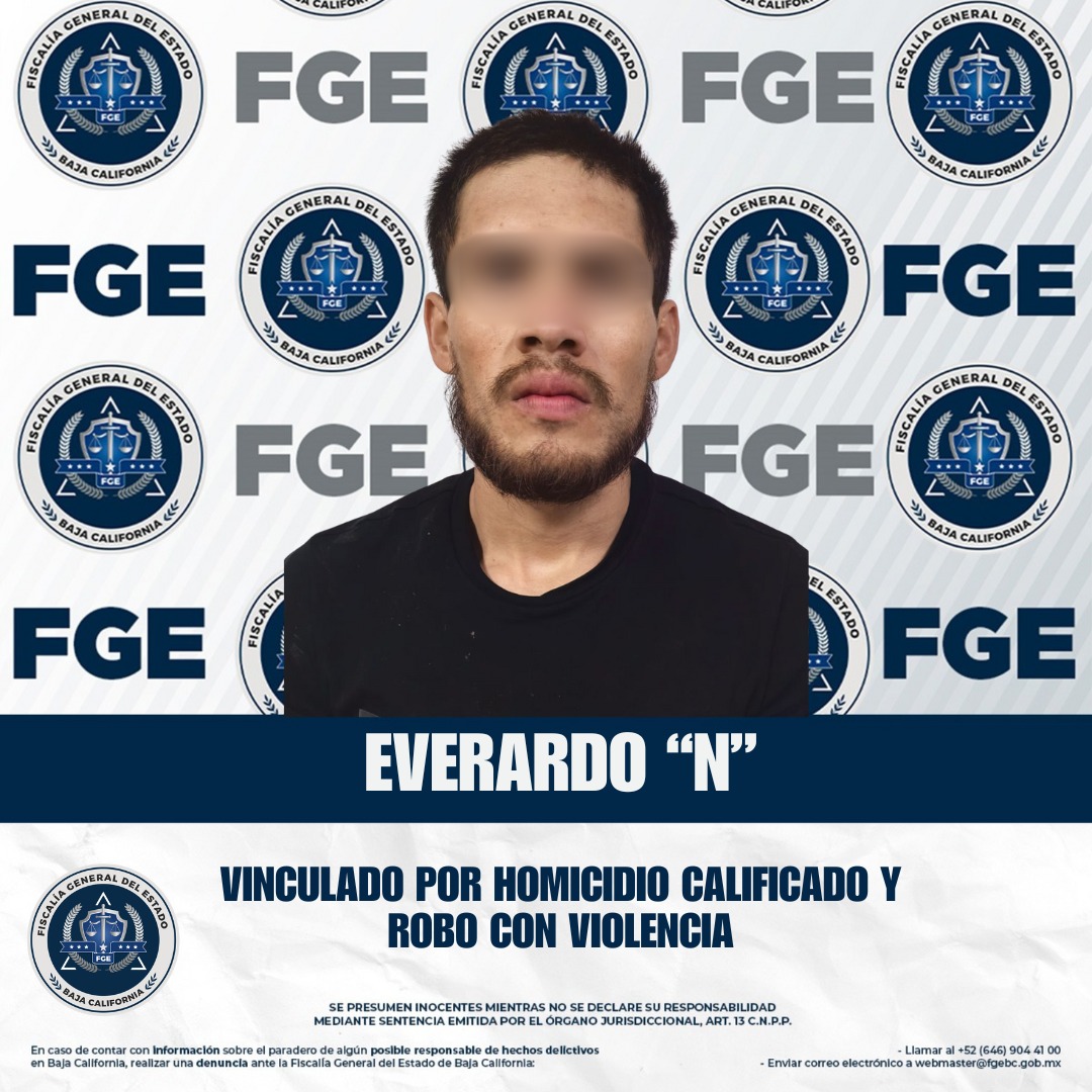 ENSENADA, BAJA CALIFORNIA. - La Fiscalía General del Estado de Baja California, a cargo de la Fiscal General, Dra. Ma. Elena Andrade Ramírez, obtuvo del juez de control la vinculación a proceso y la medida cautelar de prisión preventiva contra Everardo “N”, alias “El Ever”, por homicidio calificado con premeditación y ventaja, así como contra él y José Martín “N” por su probable participación en los delitos de robo calificado a casa habitación y robo de vehículos.
