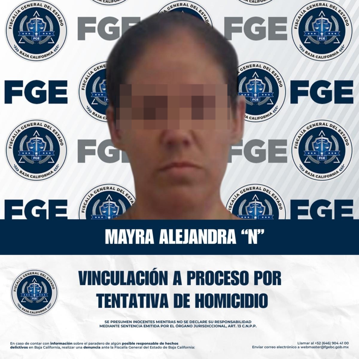 TIJUANA, BAJA CALIFORNIA. - La Fiscalía General del Estado de Baja California, a través de la Fiscalía Especializada en Delitos Contra la Vida, informa que se logró la vinculación a proceso en contra de Mayra Alejandra “N”, por su probable responsabilidad en el delito de homicidio calificado en grado de tentativa, derivado de hechos ocurridos en la ciudad de Tijuana.