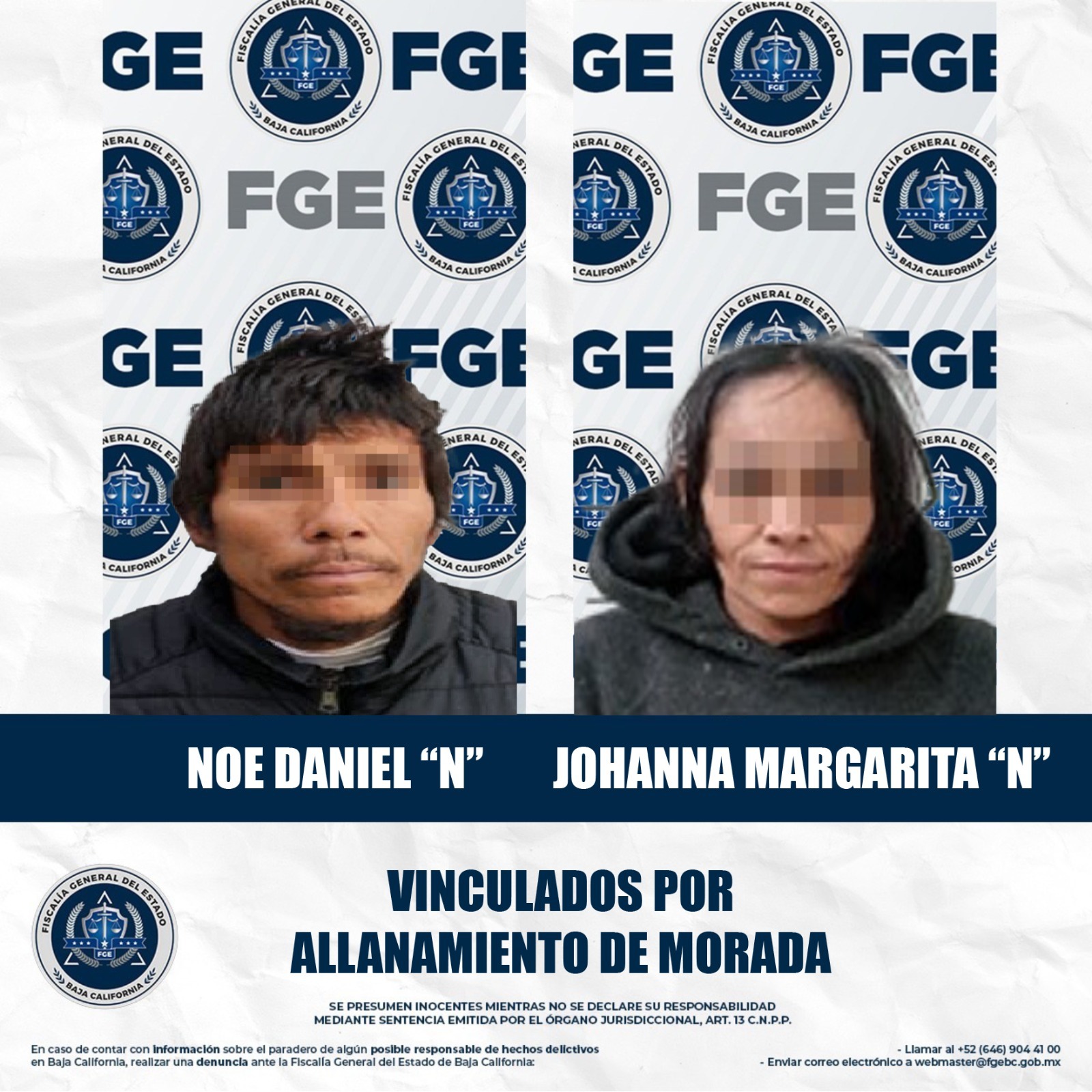 MEXICALI, BAJA CALIFORNIA. - La Fiscalía Regional de Mexicali, a través de la Unidad de Investigación de Delitos con Detenidos Poniente, obtuvo la vinculación a proceso de un hombre y una mujer, imputados por el delito de allanamiento de morada.
