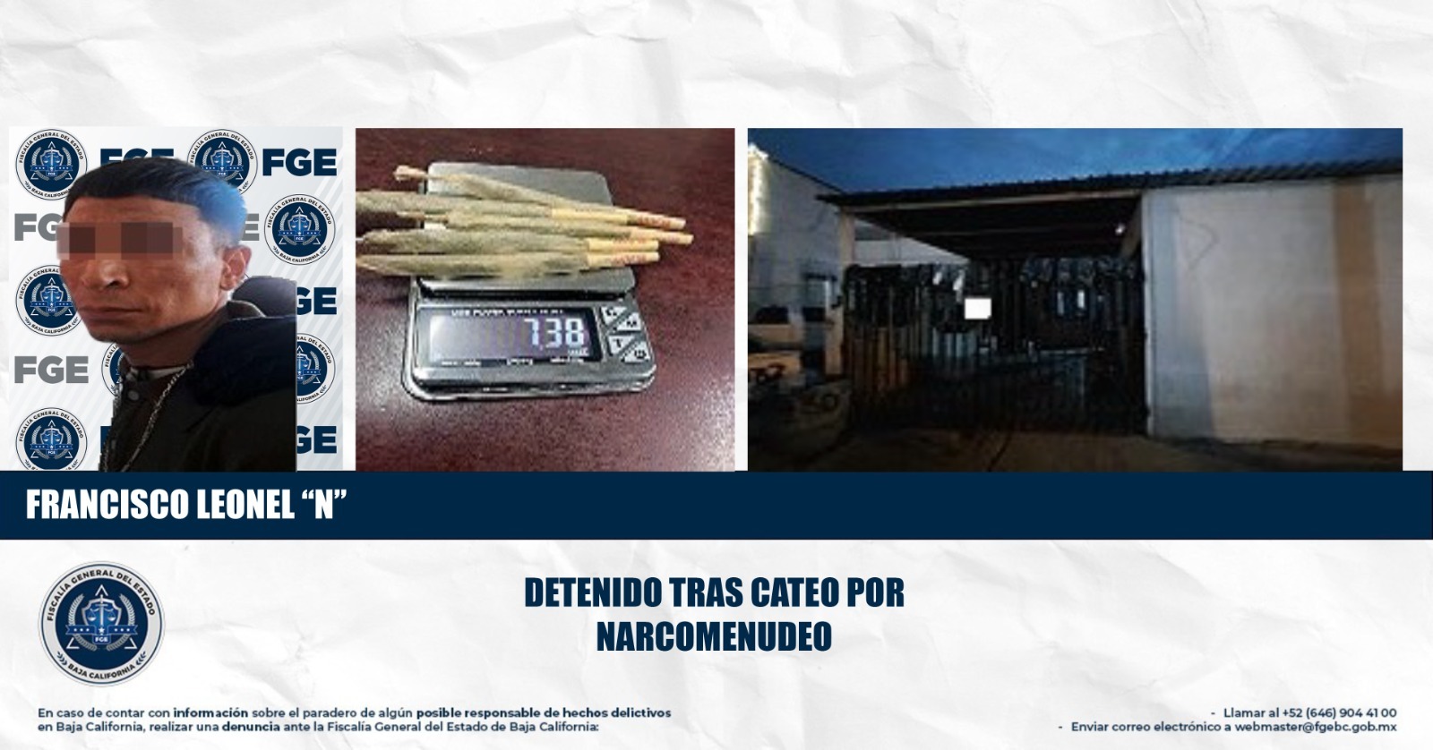 Durante el operativo se logró la detención de Francisco Leonel “N”, así como el decomiso de diversos narcóticos, entre los que destacan cinco cigarros elaborados de forma artesanal, los cuales contenían en su interior una hierba verde y seca con las características propias de la droga conocida como marihuana, además del aseguramiento del inmueble.