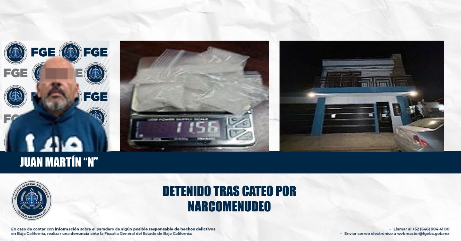 MEXICALI, BAJA CALIFORNIA. - 13 DE ENERO DE 2026.- La Fiscalía General del Estado (FGE), a través de la Fiscalía Especializada en Narcomenudeo, obtuvo con éxito la ejecución de un cateo especializado en una vivienda del fraccionamiento Misión de Puebla.