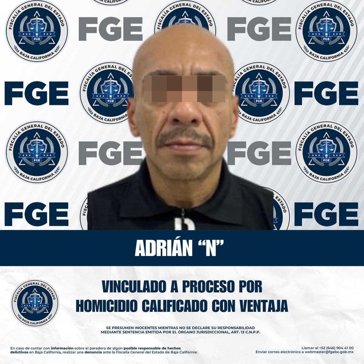 TIJUANA, BAJA CALIFORNIA. - La Fiscalía General del Estado, a través de la Fiscalía Especializada en Delitos Contra la Vida, obtuvo la vinculación a proceso de Adrián “N”, alias “El Capi” por su presunta responsabilidad en el delito de homicidio calificado con ventaja, imponiéndose como medida cautelar la prisión preventiva oficiosa.