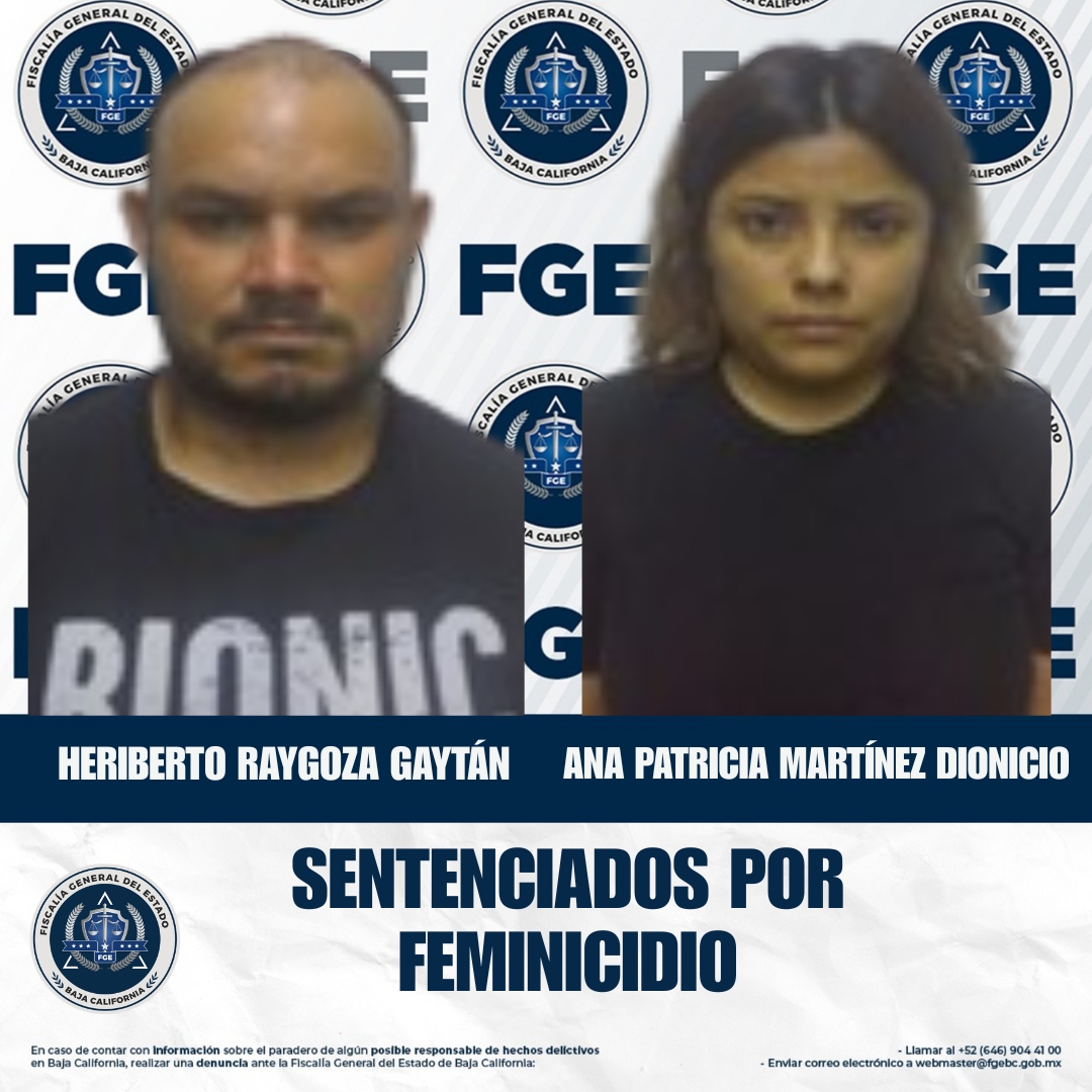 SAN QUINTÍN, BAJA CALIFORNIA. - La Fiscalía General del Estado, a través de la Fiscalía Especializada en Delitos Contra la Vida, obtuvo sentencia condenatoria en contra de Heriberto Raygoza Gaytán y Ana Patricia Martínez Dionicio por su responsabilidad en el delito de feminicidio, como resultado de una investigación sólida que permitió esclarecer los hechos y acreditar su participación.