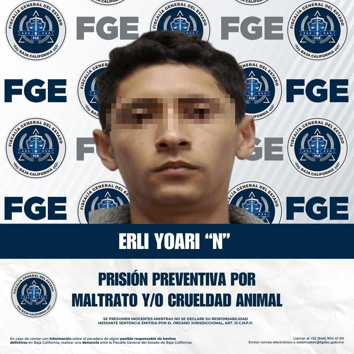 TIJUANA, BAJA CALIFORNIA. - La Unidad de Investigación con Detenido, adscrita a la Fiscalía Regional de Tijuana, obtuvo la vinculación a proceso y la imposición de la medida cautelar de prisión preventiva en contra de Erli Yoari “N”, por su probable responsabilidad en el delito de maltrato o crueldad animal.