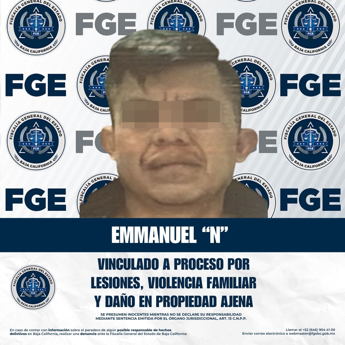 TIJUANA, BAJA CALIFORNIA. - La Fiscalía General del Estado de Baja California, a través de la Unidad de Investigación con Detenido de la Fiscalía Regional de Tijuana, obtuvo la vinculación a proceso y la imposición de la medida cautelar de prisión preventiva justificada en contra de Emmanuel “N”, por su probable responsabilidad en los delitos de lesiones, violencia familiar y daño en propiedad ajena.