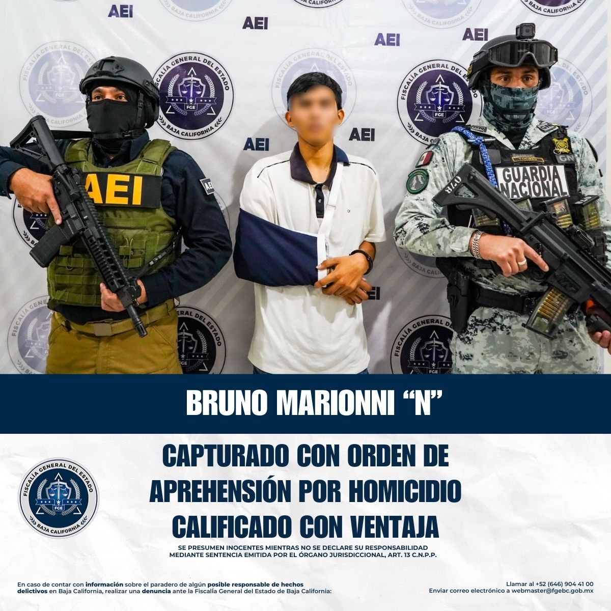 TIJUANA, BAJA CALIFORNIA. - Elementos de la Agencia Estatal de Investigación, adscritos a la Unidad Especializada en Delitos Contra la Vida de la Fiscalía General del Estado de Baja California, cumplimentaron una orden de aprehensión en contra de Bruno Marionni “N”, alias “El Bruno”, por su presunta responsabilidad en el delito de homicidio calificado con ventaja.