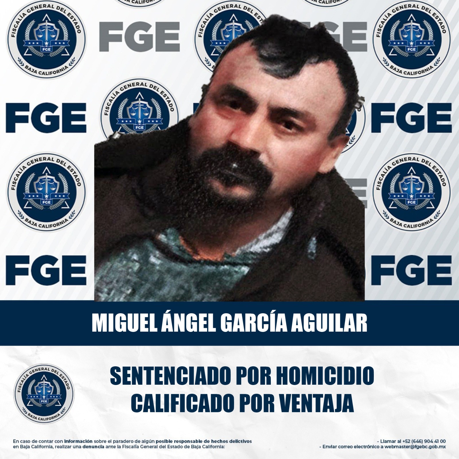 MEXICALI, BAJA CALIFORNIA. - La Fiscalía General del Estado de Baja California, a través de la Fiscalía Especializada en Delitos Contra la Vida, logró sentencia condenatoria en contra de Miguel Ángel García Aguilar por el delito de homicidio calificado por ventaja.