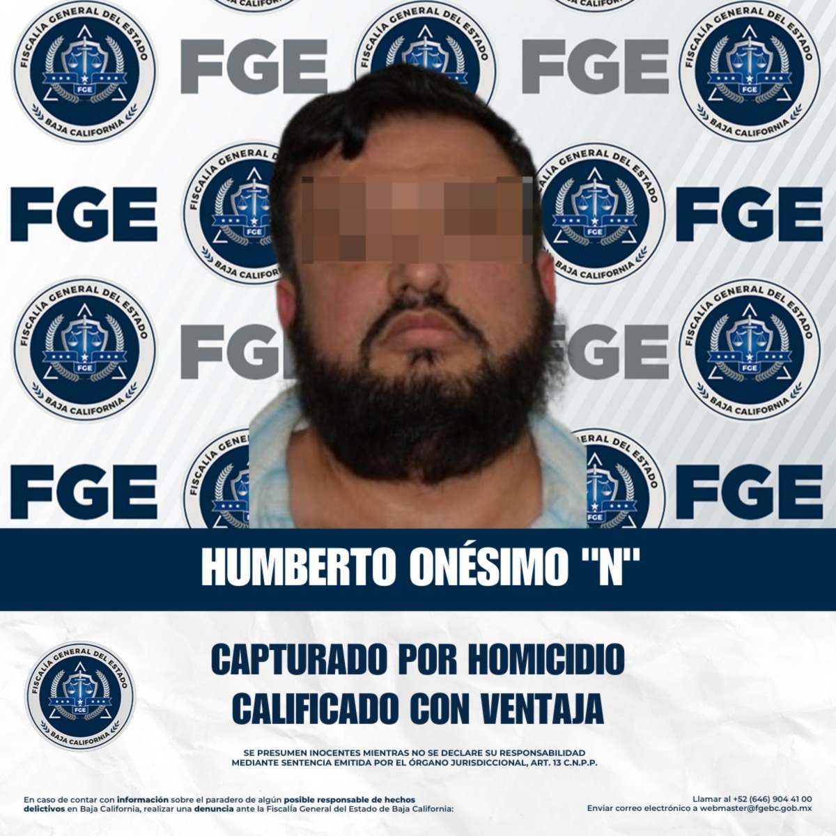 TIJUANA, BAJA CALIFORNIA. - La Fiscalía General del Estado, a través de la Agencia Estatal de Investigación Zona Tijuana, adscrita a la Unidad Especializada en Delitos contra la Vida, cumplimentó una orden de aprehensión el día 14 de enero de 2026, a las 22:00 horas, en contra de Humberto Onésimo “N”, por su probable responsabilidad en el delito de homicidio calificado con ventaja.