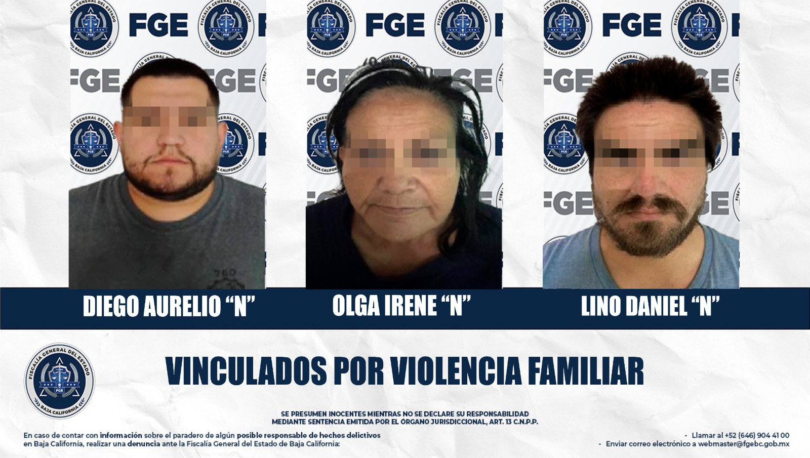 MEXICALI, BAJA CALIFORNIA. - Con base en los datos de prueba presentados por la Fiscalía Regional de Mexicali, a través de la Unidad de Investigación con Detenidos Oriente, se obtuvo la medida cautelar de prisión preventiva en contra de dos hombres y una mujer, imputados por el delito de violencia familiar, en audiencias celebradas por separado.
