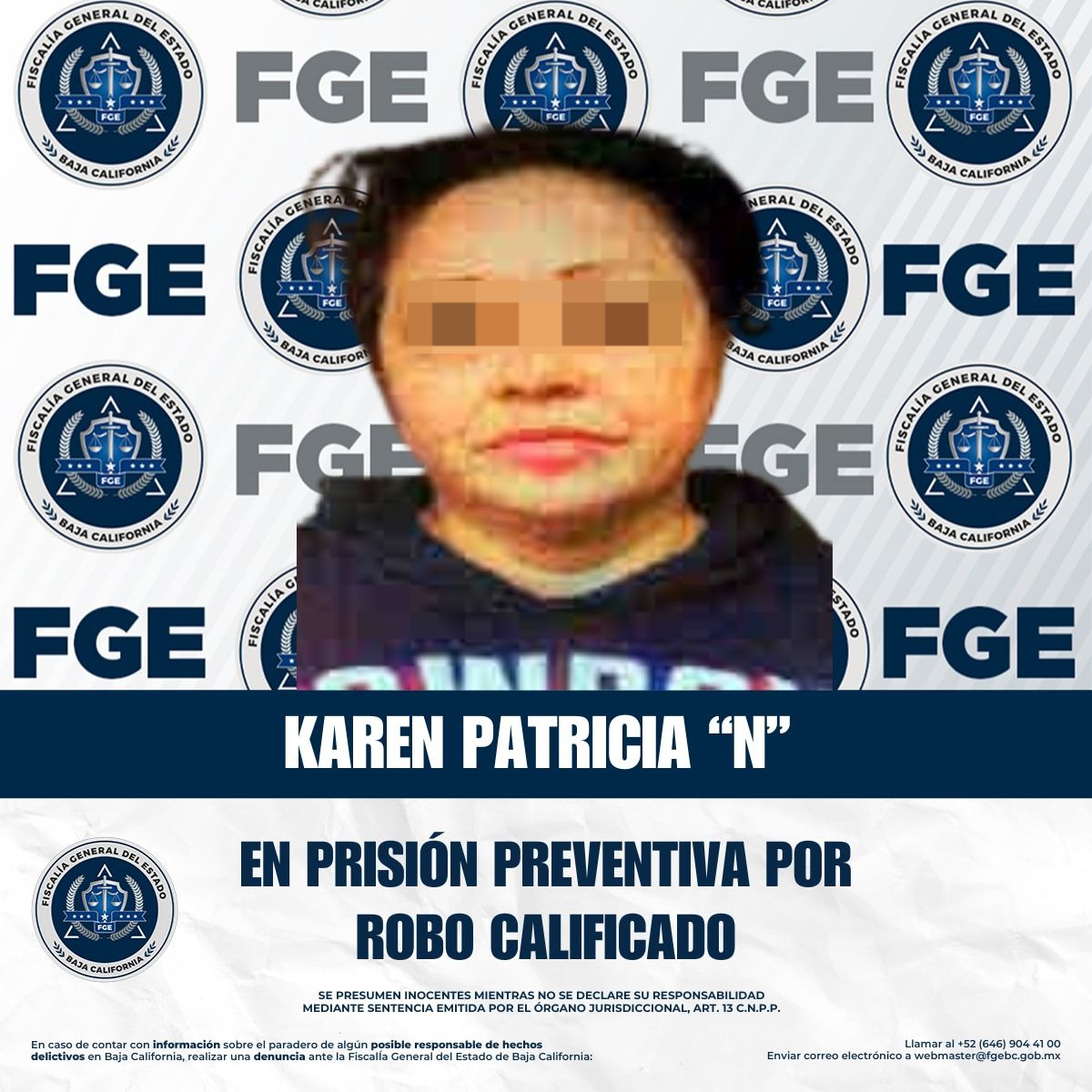 TIJUANA, BAJA CALIFORNIA. - La Unidad de Investigación de Robos Zona Mariano Matamoros, adscrita a la Fiscalía Regional de Tijuana, obtuvo la vinculación a proceso y la imposición de la medida cautelar de prisión preventiva en contra de Karen Patricia “N”, por el delito de robo calificado cometido en establecimiento comercial abierto al público.