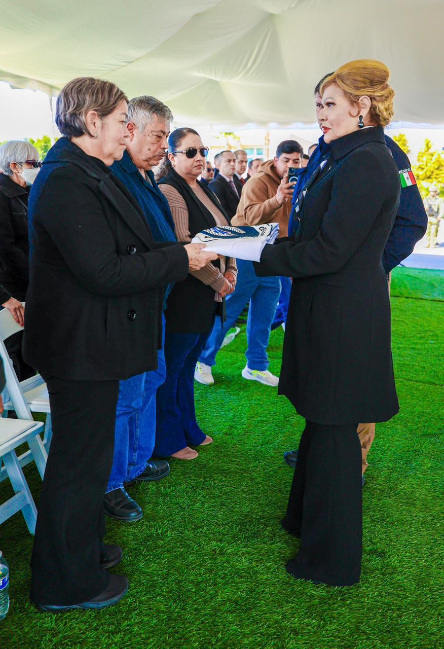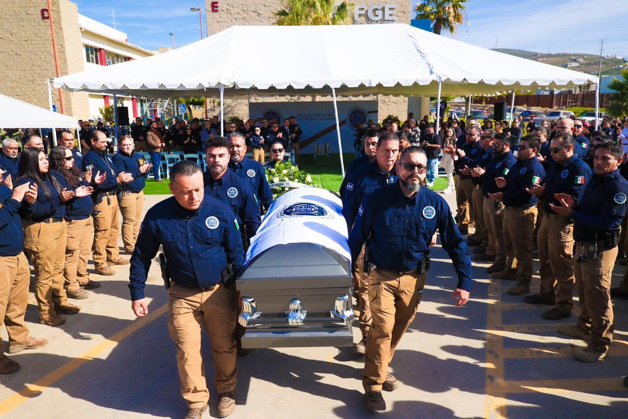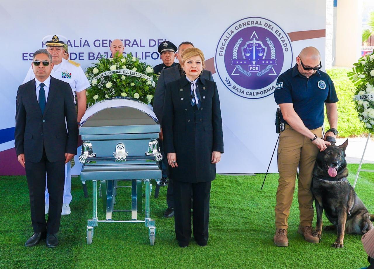 ENSENADA, BAJA CALIFORNIA. - La Fiscalía General del Estado (FGE), encabezada por la Fiscal General, Dra. Ma. Elena Andrade Ramírez, llevó a cabo la ceremonia de honras fúnebres en memoria del subcomandante operativo de la Agencia Estatal de Investigación (AEI) en Ensenada, Israel Ortiz Castillo, como un acto solemne de reconocimiento a su entrega, valor y compromiso con la procuración de justicia en Baja California.