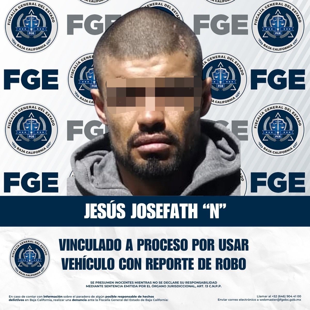 TIJUANA, BAJA CALIFORNIA. - La Fiscalía Regional de Tijuana, a través de la Unidad de Investigación de Robo de Vehículos, Zona Tijuana, informó que logró obtener la vinculación a proceso y la imposición de la medida cautelar de prisión preventiva justificada en contra de Jesús Josefath “N”, por su probable responsabilidad en el delito de uso de vehículo de motor con reporte de robo.