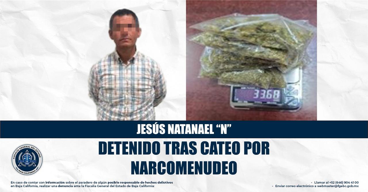 MEXICALI, BAJA CALIFORNIA. - En seguimiento a denuncias anónimas por la presunta venta de droga, la Fiscalía General del Estado (FGE), a través de la Fiscalía Especializada en Narcomenudeo ejecutó una orden de cateo en un domicilio de la colonia González Ortega, donde fue detenido un sujeto y se aseguró droga.