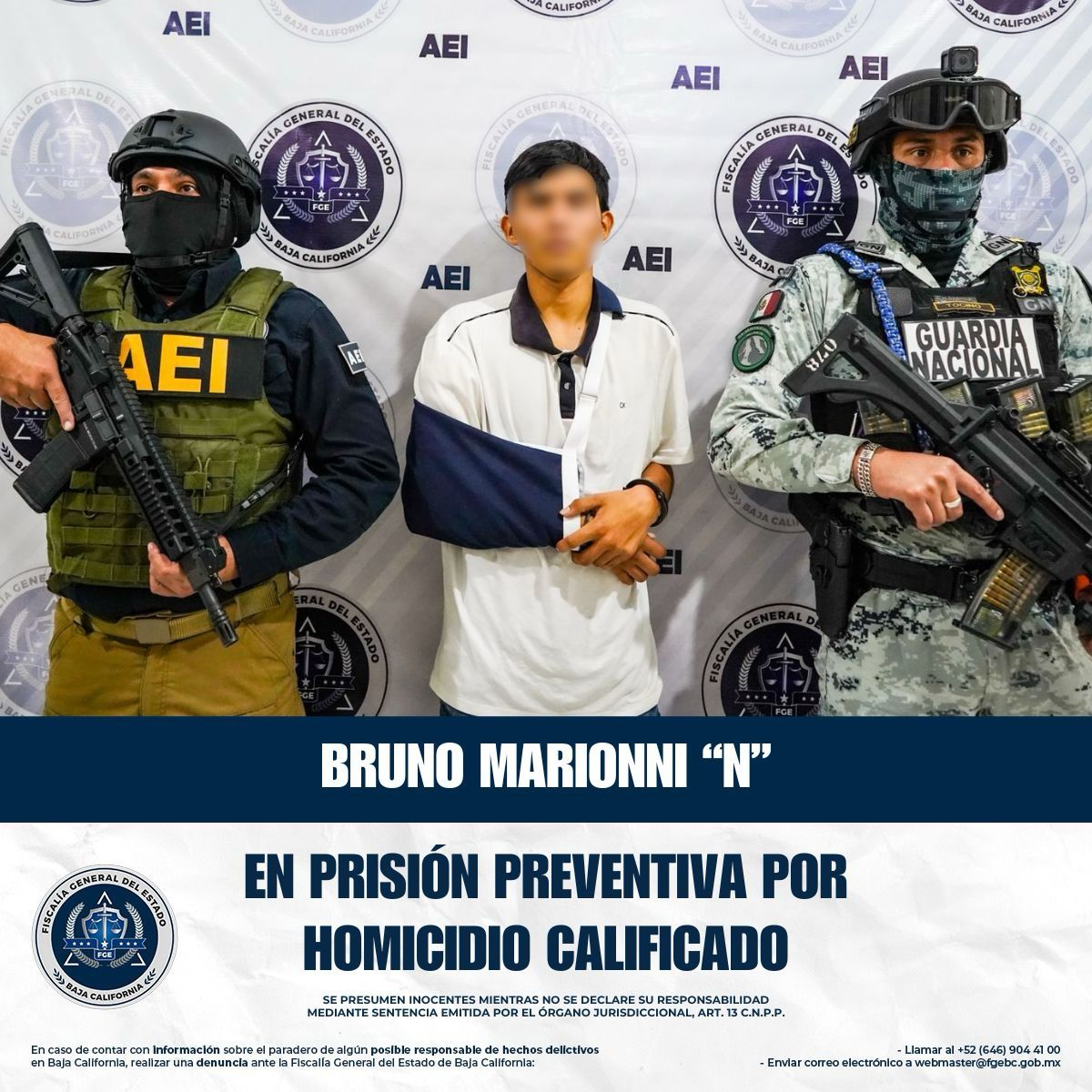 TIJUANA, BAJA CALIFORNIA. - La Fiscalía General del Estado, a través de la Fiscalía Especializada en Delitos Contra la Vida logró la vinculación a proceso y la medida cautelar de prisión preventiva en contra de Bruno Marionni “N”, alias “El Bruno”, por su presunta responsabilidad en el delito de homicidio calificado con ventaja.