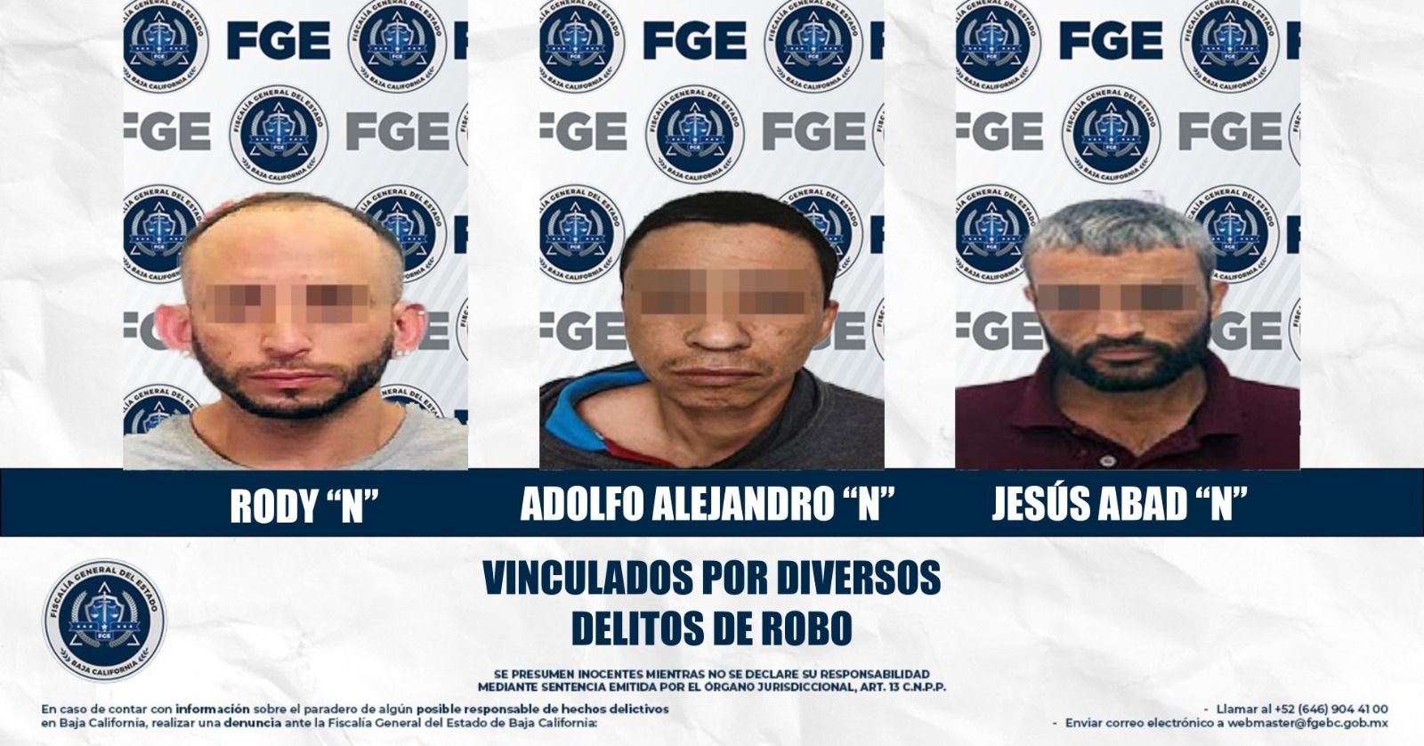 MEXICALI, BAJA CALIFORNIA. - La Fiscalía Regional de Mexicali, a través de la Unidad de Investigación de Delitos de Robo Poniente, y la de Robos Oriente, obtuvo la vinculación a proceso de tres hombres imputados por los delitos de robo calificado a lugar cerrado y robo calificado a casa habitación con violencia.