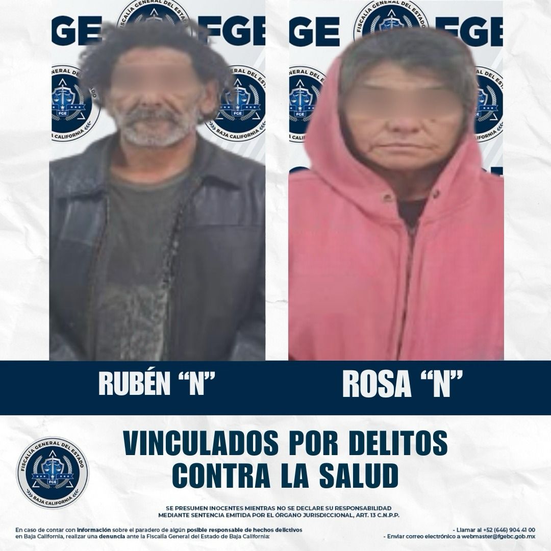 SAN QUINTÍN, BAJA CALIFORNIA. - La Fiscalía Especializada en Narcomenudeo obtuvo la vinculación a proceso de Rubén “N” y Rosa “N” por delitos contra la salud, como resultado de las investigaciones derivadas de su detención en la colonia Lázaro Cárdenas.