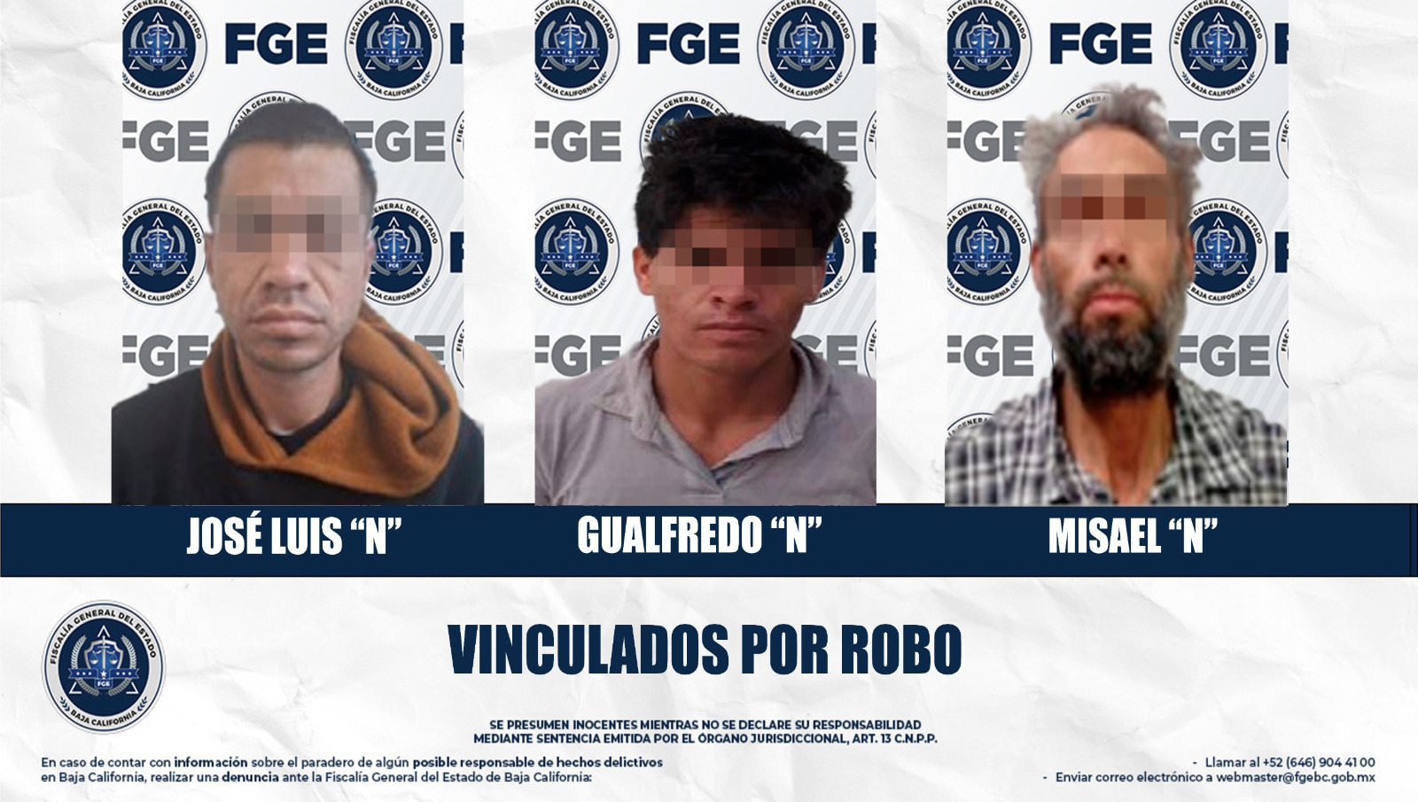 MEXICALI, BAJA CALIFORNIA. - Como resultado de las investigaciones para combatir el delito de robo en sus diversas modalidades, la Fiscalía Regional de Mexicali obtuvo la vinculación a proceso de tres personas imputadas por distintos hechos delictivos, en audiencias realizadas de manera independiente.