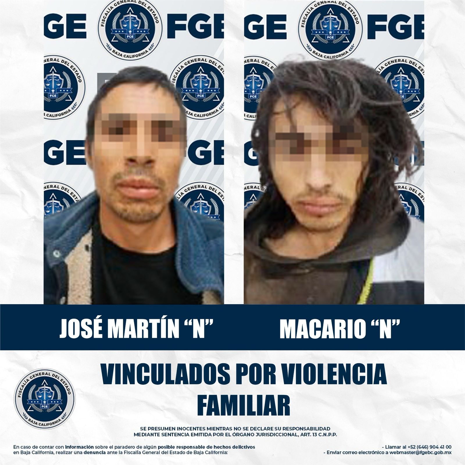 MEXICALI, BAJA CALIFORNIA. - Con base en los elementos de prueba presentados por la Fiscalía Regional de Mexicali, a través de la Unidad de Investigación de Delitos Foránea de Guadalupe Victoria, se obtuvo la medida cautelar de prisión preventiva en contra de dos hombres acusados del delito de violencia familiar.