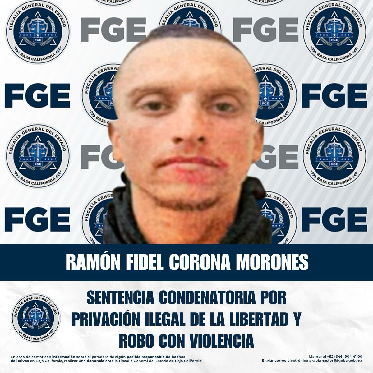 TECATE, BAJA CALIFORNIA. - Gracias a las directrices de la Fiscal General del Estado, Dra. Ma. Elena Andrade Ramírez, quien ha insistido en no permitir la impunidad en Baja California, la Fiscalía Regional de Tecate logró obtener una sentencia condenatoria contra Ramón Fidel Corona Morones por los delitos de privación de la libertad agravada, robo con violencia y robo de vehículo ejecutado con violencia. La sentencia fue obtenida mediante un procedimiento abreviado, en el cual se presentaron pruebas contundentes que comprobaron su responsabilidad en los hechos.