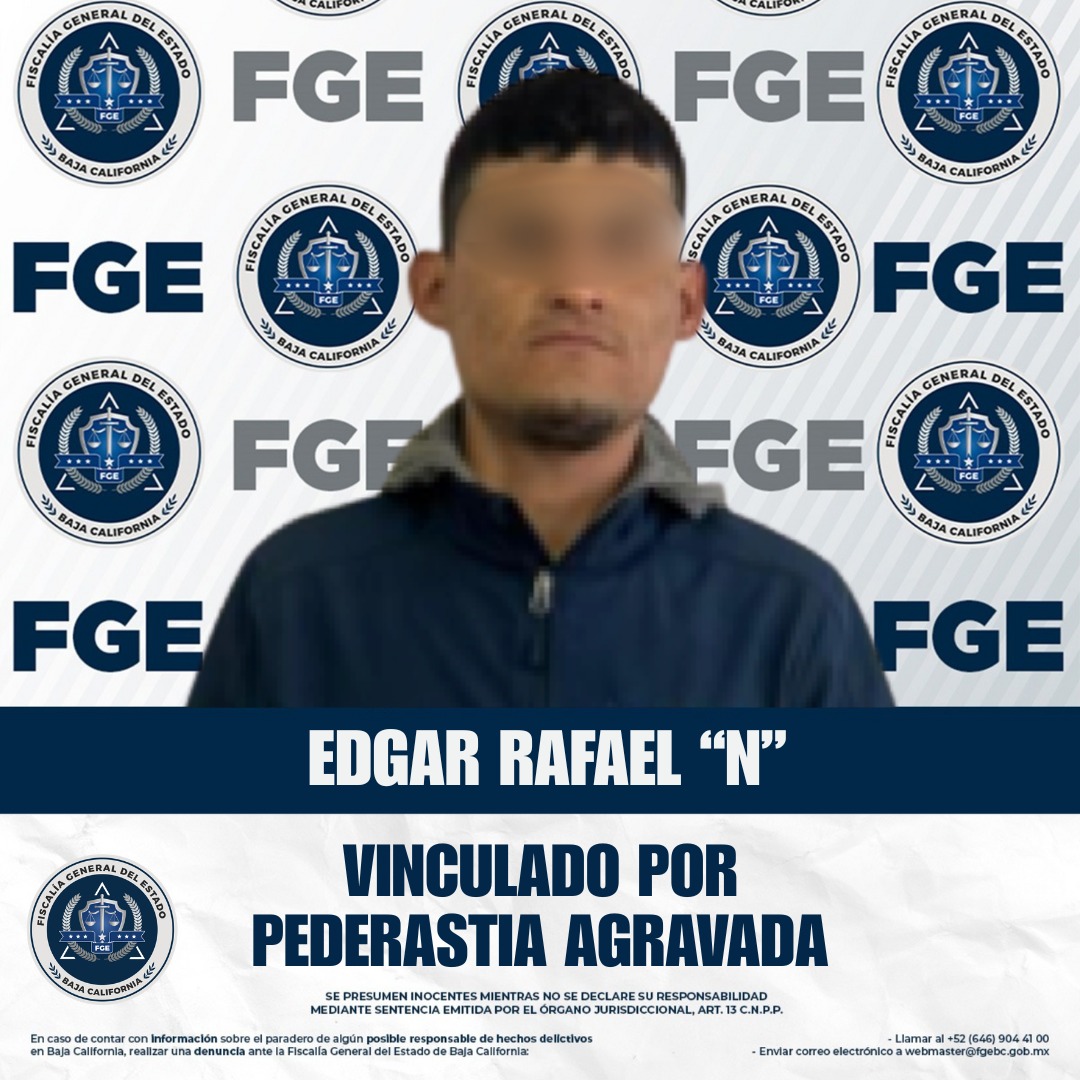 ENSENADA, BAJA CALIFORNIA. - Como resultado de sus acciones en la persecución del delito, la Fiscalía General del Estado logró un auto de vinculación a proceso contra Edgar Rafael “N” por su probable responsabilidad en el delito de pederastia agravada, cometido en perjuicio de una menor de edad.