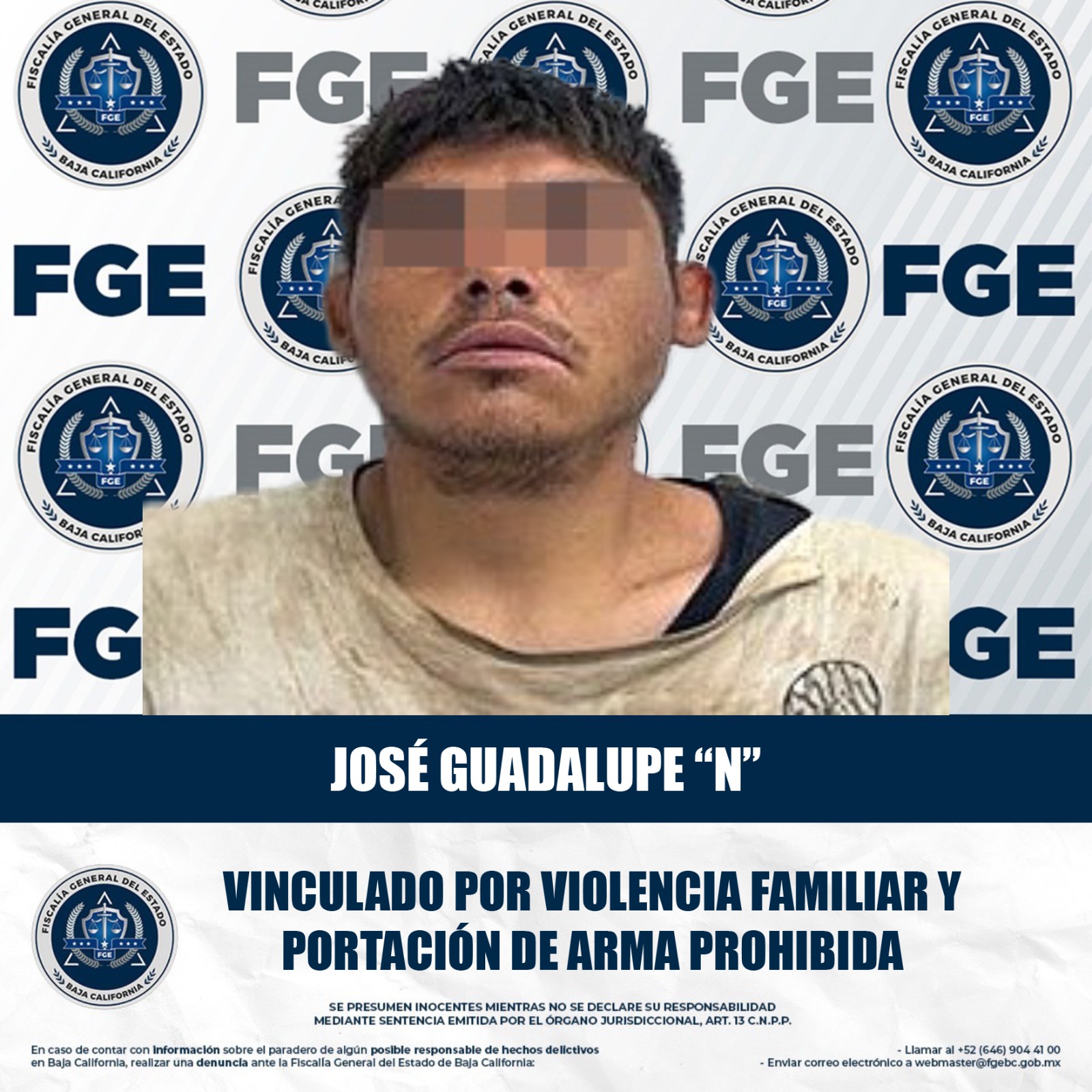 MEXICALI, BAJA CALIFORNIA. - La Fiscalía Regional de Mexicali, a través de la Unidad de Investigación Foránea de Guadalupe Victoria, logró el inicio del proceso penal en contra de un imputado por los delitos de violencia familiar y portación de arma prohibida.