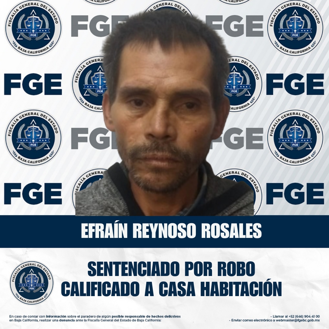 ENSENADA, BAJA CALIFORNIA. - La Fiscalía Regional de Ensenada obtuvo una sentencia condenatoria en contra de Efraín Reynoso Rosales, por su responsabilidad en el delito de robo calificado a casa habitación, derivado de las investigaciones realizadas.