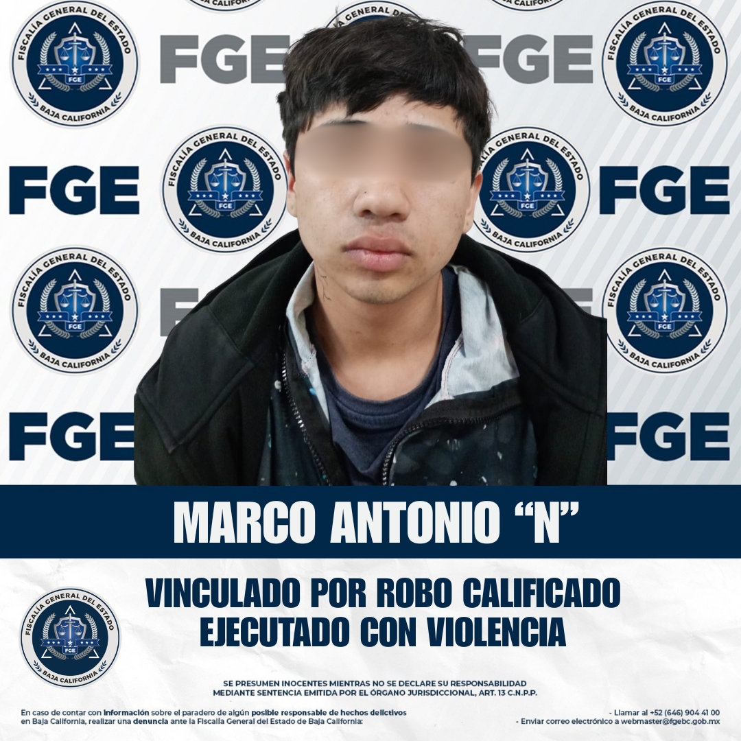 ENSENADA, BAJA CALIFORNIA. - La Fiscalía Regional de Ensenada obtuvo la vinculación a proceso de Marco Antonio “N” por el delito de robo calificado ejecutado con violencia, cometido en horario nocturno, como resultado de las diligencias de investigación realizadas.