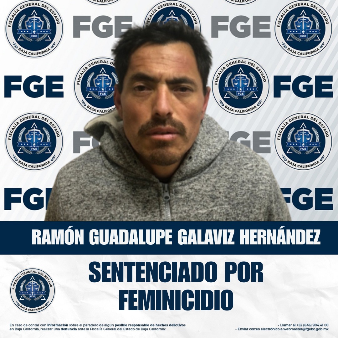 ENSENADA, BAJA CALIFORNIA. - La Fiscalía General del Estado, a través de la Fiscalía Especializada en Delitos Contra la Vida, obtuvo una sentencia de 35 años de prisión contra Ramón Guadalupe Galaviz Hernández, declarado culpable del delito de feminicidio en agravio de su pareja sentimental. El fallo se dictó tras un juicio oral en el que se acreditó plenamente su responsabilidad.