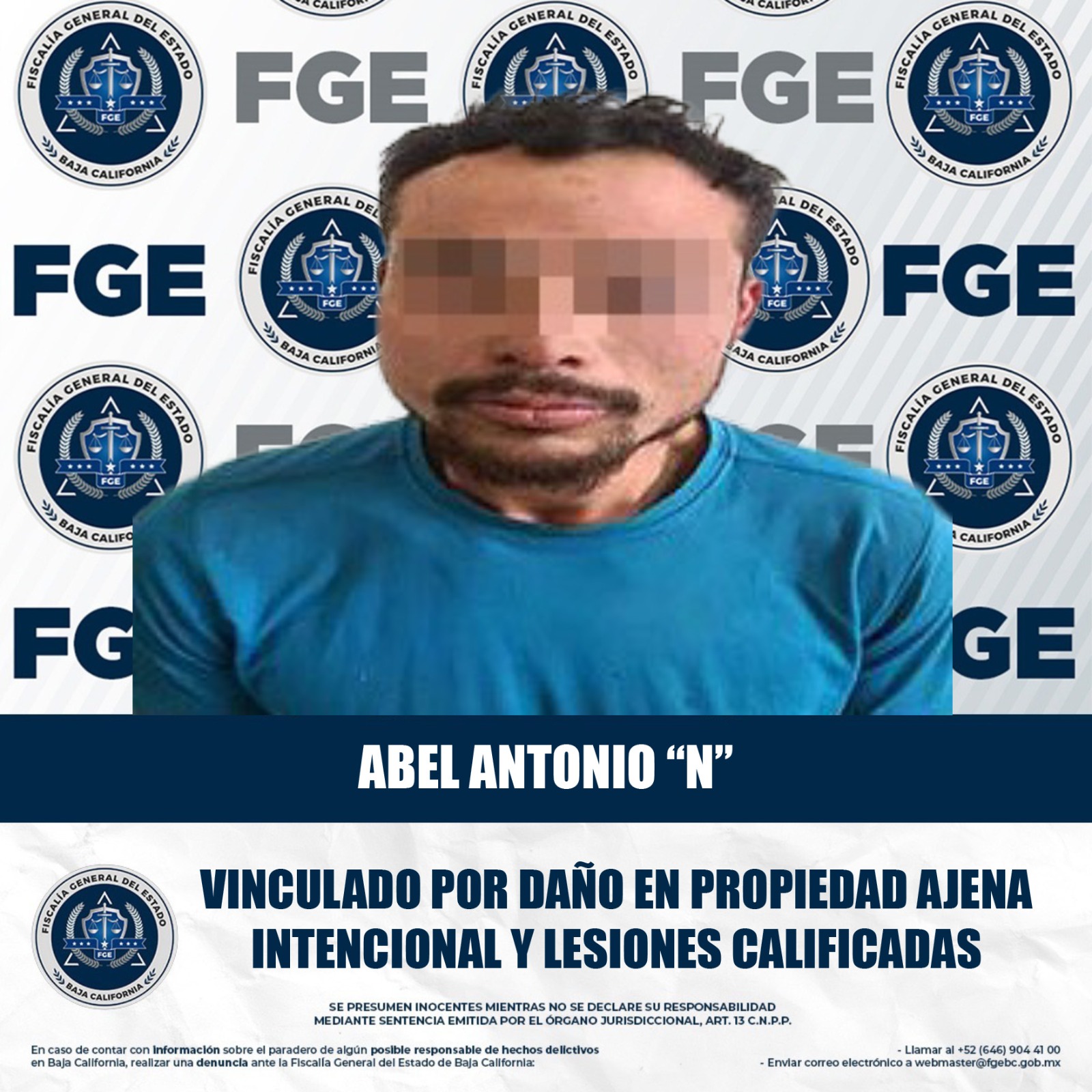 MEXICALI, BAJA CALIFORNIA. - La Fiscalía Regional de Mexicali, a través de la Unidad de Investigación de Delitos Foránea de Guadalupe Victoria, obtuvo, con base en los elementos de prueba, la vinculación a proceso de un acusado por los delitos de daño en propiedad ajena intencional y lesiones calificadas.