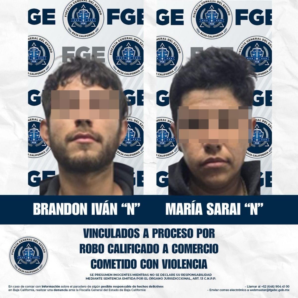 TIJUANA, BAJA CALIFORNIA. - La Fiscalía Regional de Tijuana, a través de la Unidad de Investigación con Detenido, obtuvo la vinculación a proceso y la imposición de prisión preventiva oficiosa en contra de Brandon Iván “N” y María Saraí “N”, por su presunta responsabilidad en el delito de robo calificado a comercio abierto al público, ejecutado con violencia.