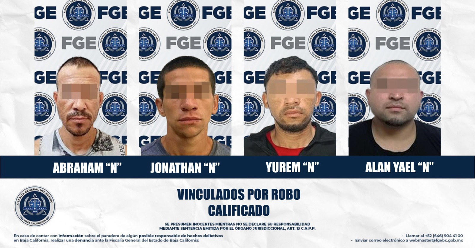 MEXICALI, BAJA CALIFORNIA. - La Fiscalía Regional de Mexicali, a través de la Unidad de Investigación de Delitos de Robos Poniente y Oriente, obtuvo la vinculación a proceso de cuatro personas por su probable participación en diversos delitos de robo con violencia, en audiencias celebradas por separado.