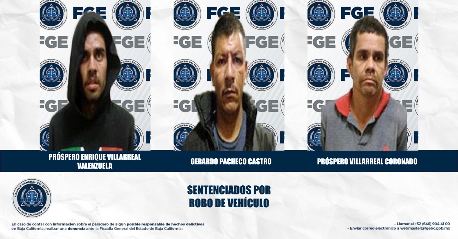 MEXICALI, BAJA CALIFORNIA. - Derivado de la presentación de pruebas y argumentos sólidos, la Fiscalía Regional de Mexicali obtuvo sentencia condenatoria en contra de tres hombres a quienes se les encontró culpables del delito de robo de vehículo.