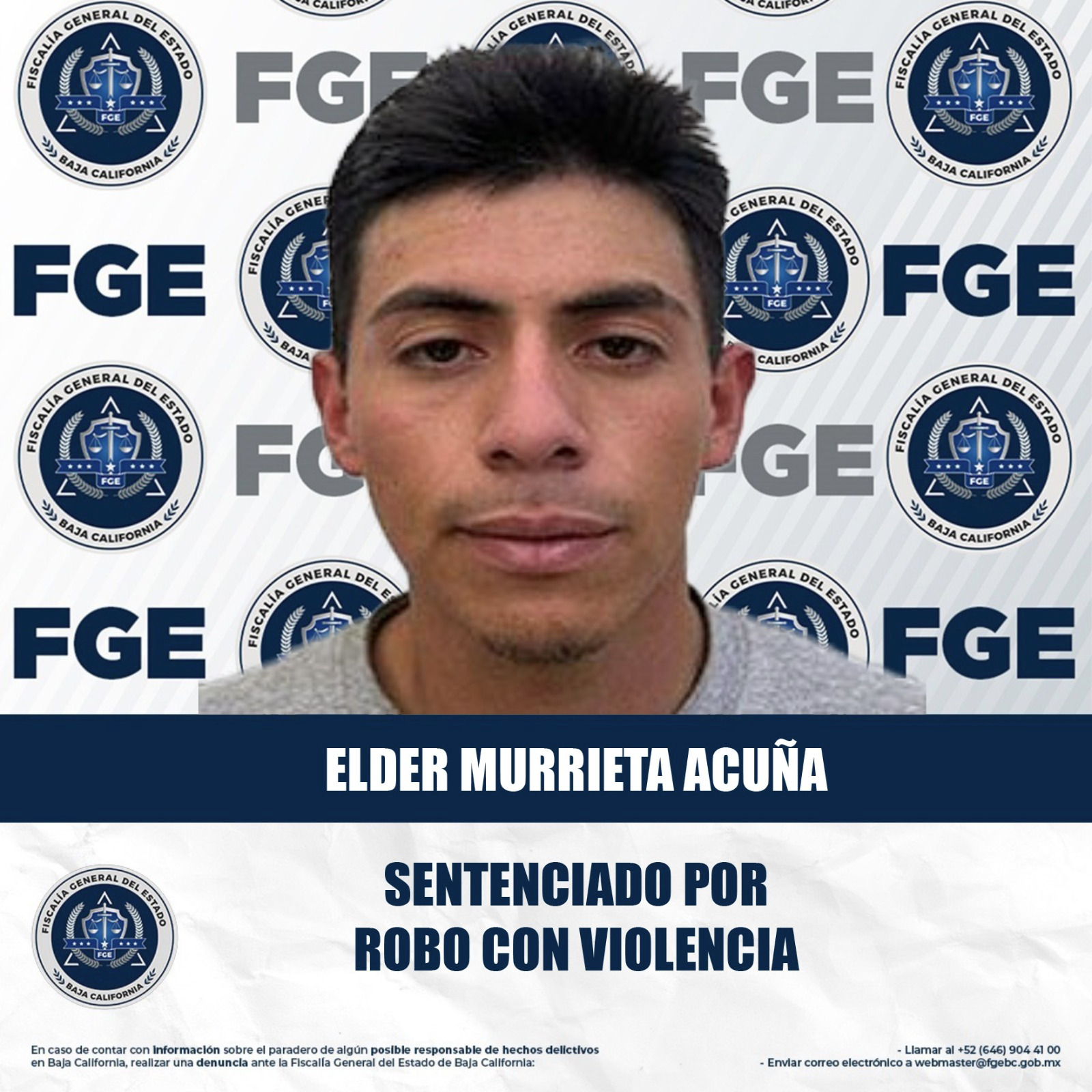 MEXICALI, BAJA CALIFORNIA. - La Fiscalía Regional de Mexicali obtuvo una sentencia condenatoria en contra de Elder Murrieta Acuña, responsable del delito de robo calificado cometido en establecimiento abierto al público con violencia.