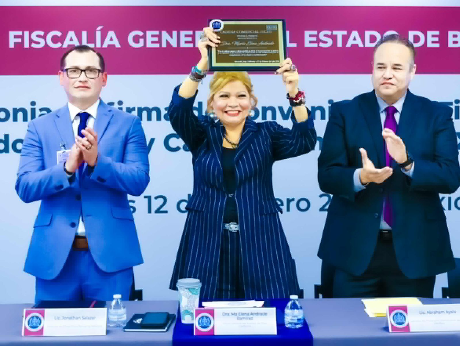 MEXICALI, BAJA CALIFORNIA. - La Fiscal General del Estado, Dra. Ma. Elena Andrade Ramírez, reiteró el compromiso institucional de trabajar de manera coordinada con el sector comercial para reducir la incidencia delictiva y fortalecer la seguridad ciudadana, durante la firma de un convenio de colaboración con la cadena comercial OXXO.