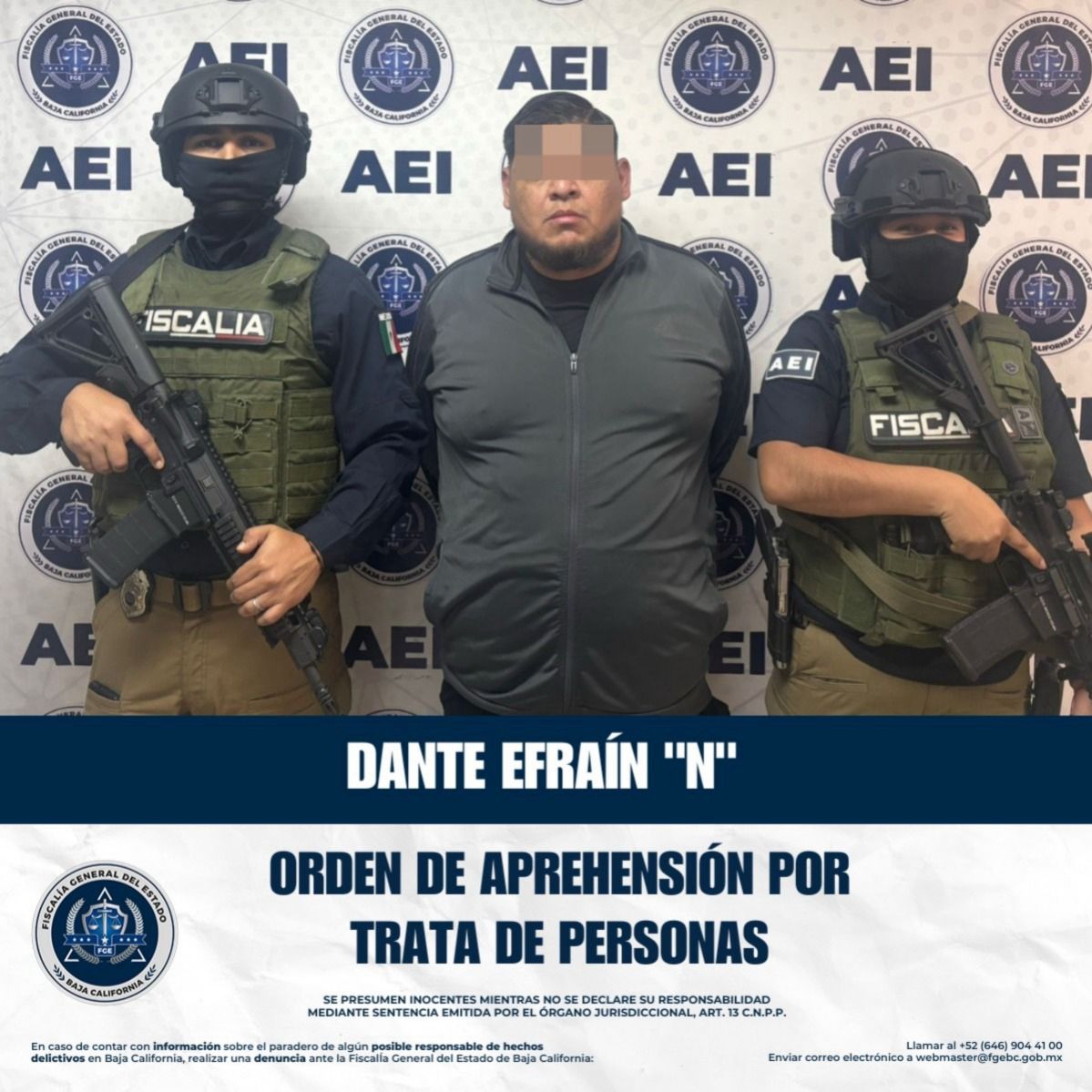 TIJUANA, BAJA CALIFORNIA. - La Fiscalía Regional de Tijuana, a través de la Agencia Estatal de Investigación adscrita a la Unidad de Violencia y Trata de Personas, logró la cumplimentación de una orden de aprehensión en contra de Dante Efraín "N".