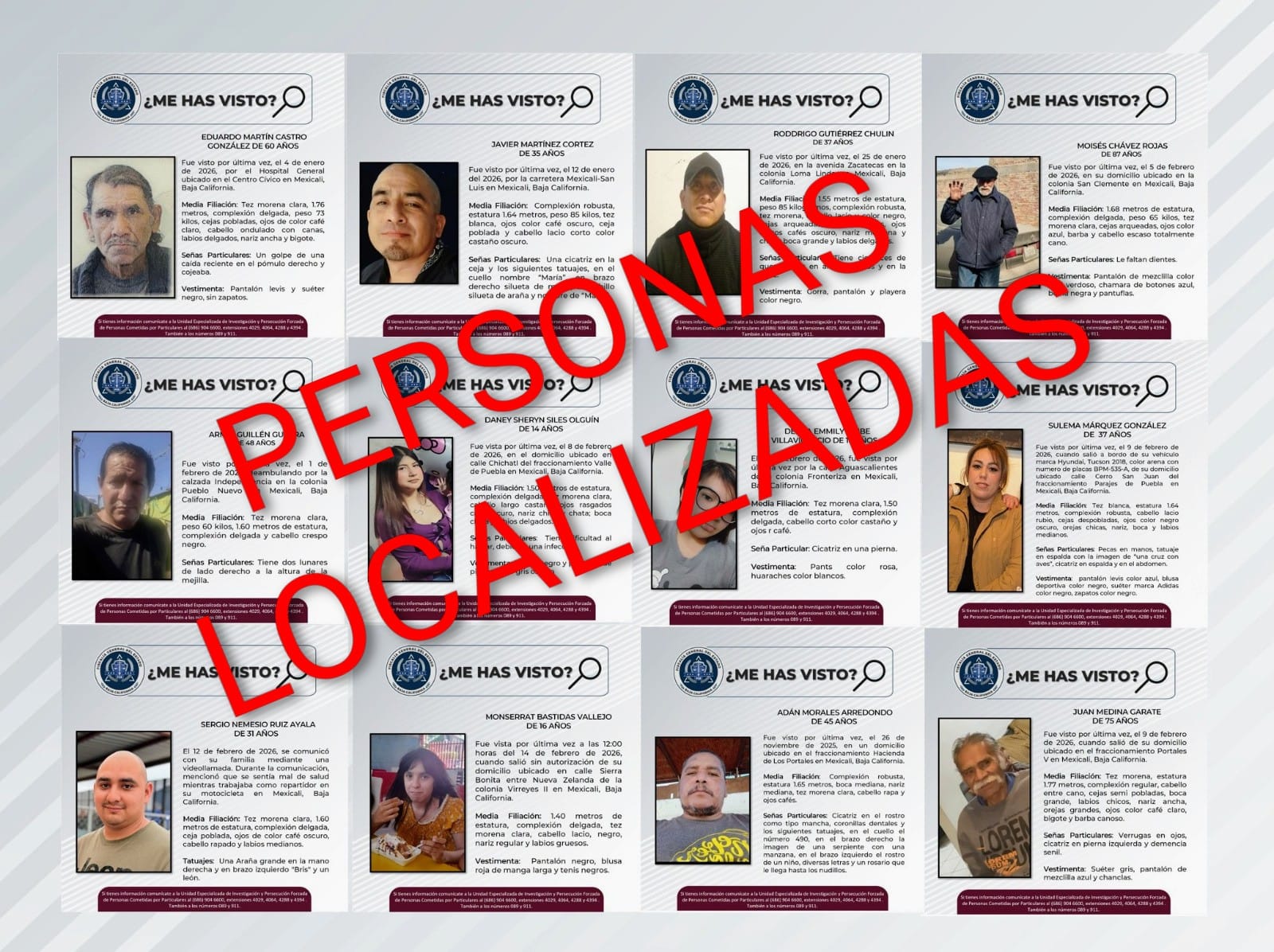 MEXICALI, BAJA CALIFORNIA. - La Fiscalía General del Estado de Baja California, a través de la Unidad Especializada para la Investigación y Persecución de Delitos de Desaparición Forzada y Desaparición Cometida por Particulares, localizó a doce personas que contaban con reporte de búsqueda.