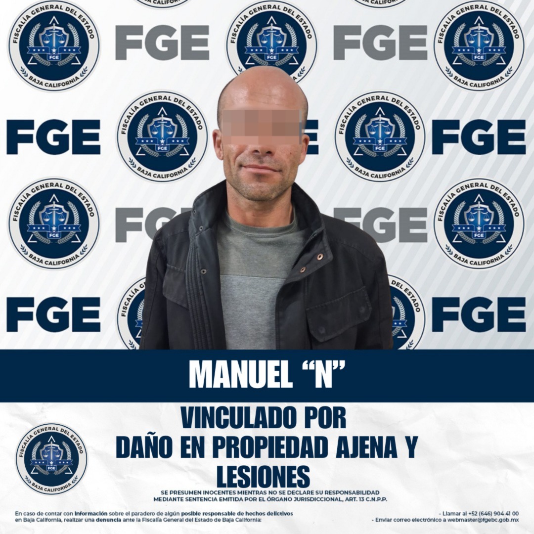 ENSENADA, BAJA CALIFORNIA. - La Fiscalía Regional de Ensenada obtuvo la vinculación a proceso y la imposición de la medida cautelar de prisión preventiva justificada en contra de Manuel “N”, por su presunta responsabilidad en los delitos de daño en propiedad ajena y lesiones, derivados de hechos ocurridos en un supermercado de la colonia Hidalgo.